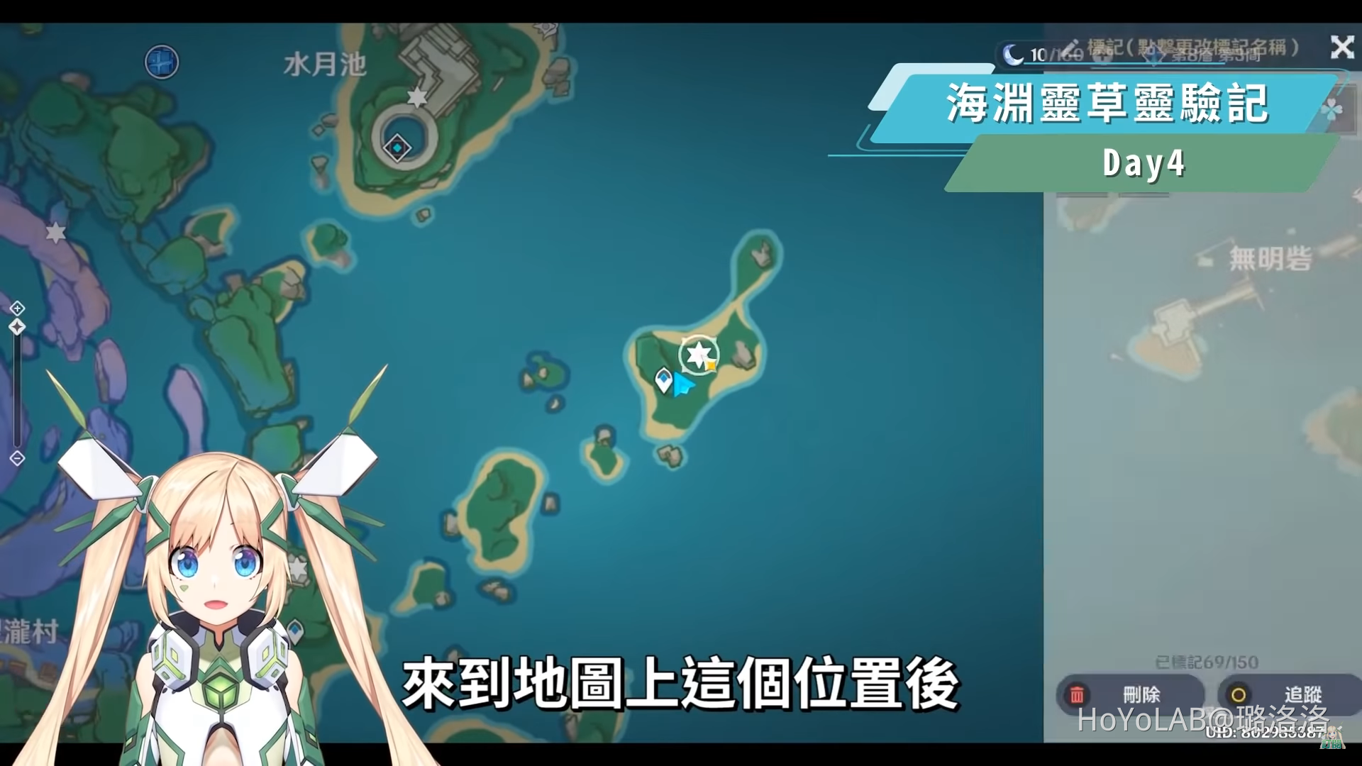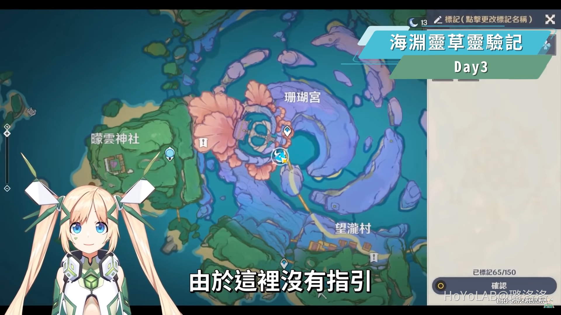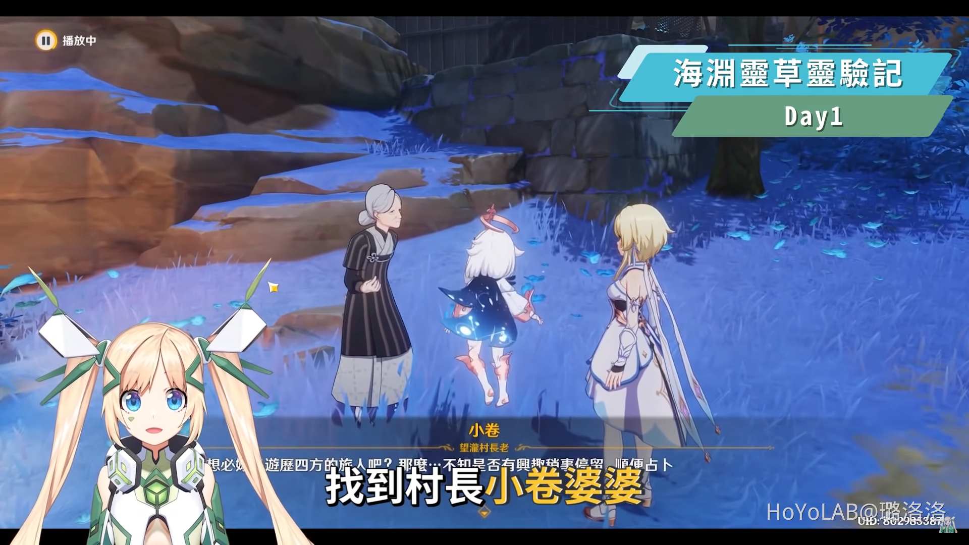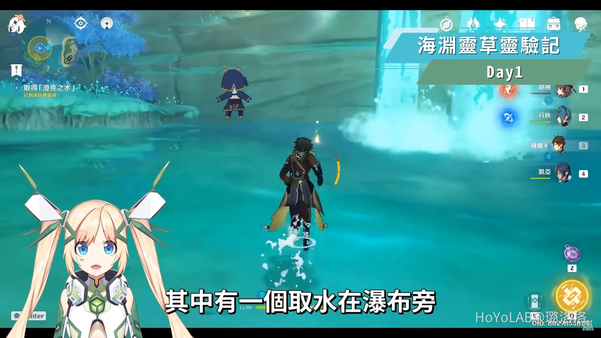 這個任務由於和月浴之淵有所關係,因此建議先解完月浴之淵再來解海淵靈草靈驗記,比較不會無法觸發,還沒解過可以參考右上方資訊卡查看先前的影片,第一天的內容主要是到神社裝取飽含心願的水,並且要在120秒內返回,途中不可以透過地圖傳送作弊否則會失敗,接著會要再到無相之水所在的周圍取水,其中有一個取水在瀑布旁會稍微有點不明顯,可以參考洛洛畫面,取完水後回去找小卷婆婆,完成第一天的任務。