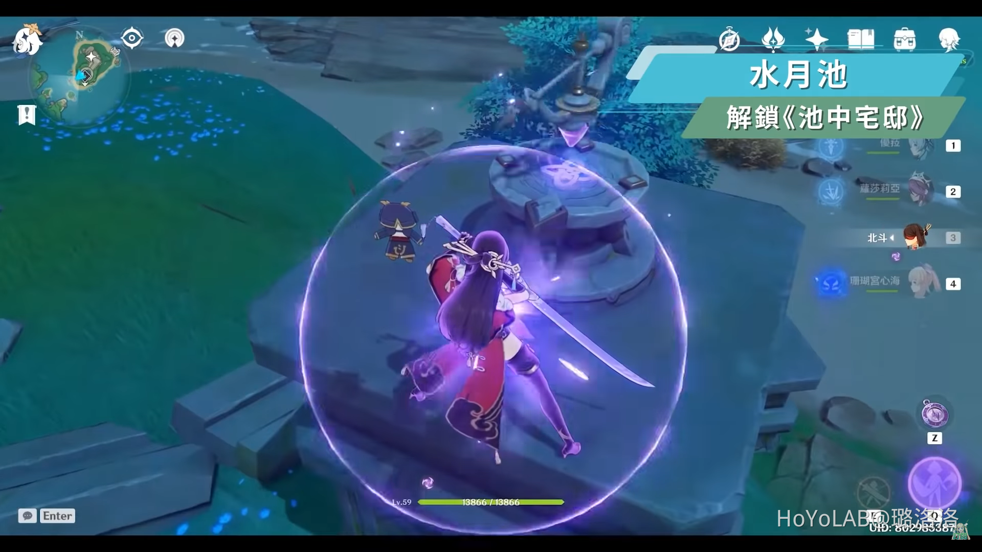 在海祈島右上有個副本「池中宅邸」,需要我們解謎附近的一些線索後才可以進入,並且這邊也有一些隱藏彩蛋可以發掘,首先來到水月池這一帶後,會發現池中宅邸的入口處都被水覆蓋在地下,我們可以先參拜神像,接著處理的附近的四個雷霆探針,這邊可以使用北斗長按E技能讓指針指到圓盤上對應的指針方向。