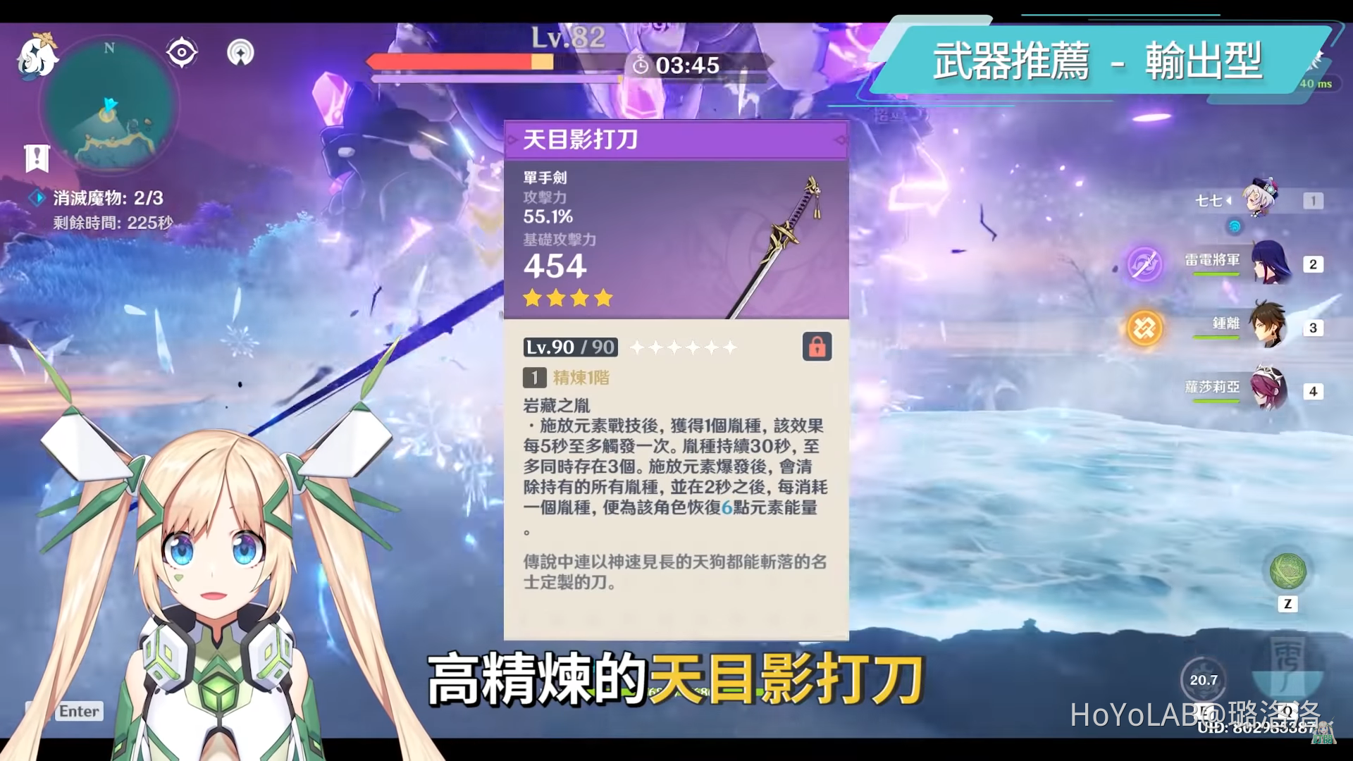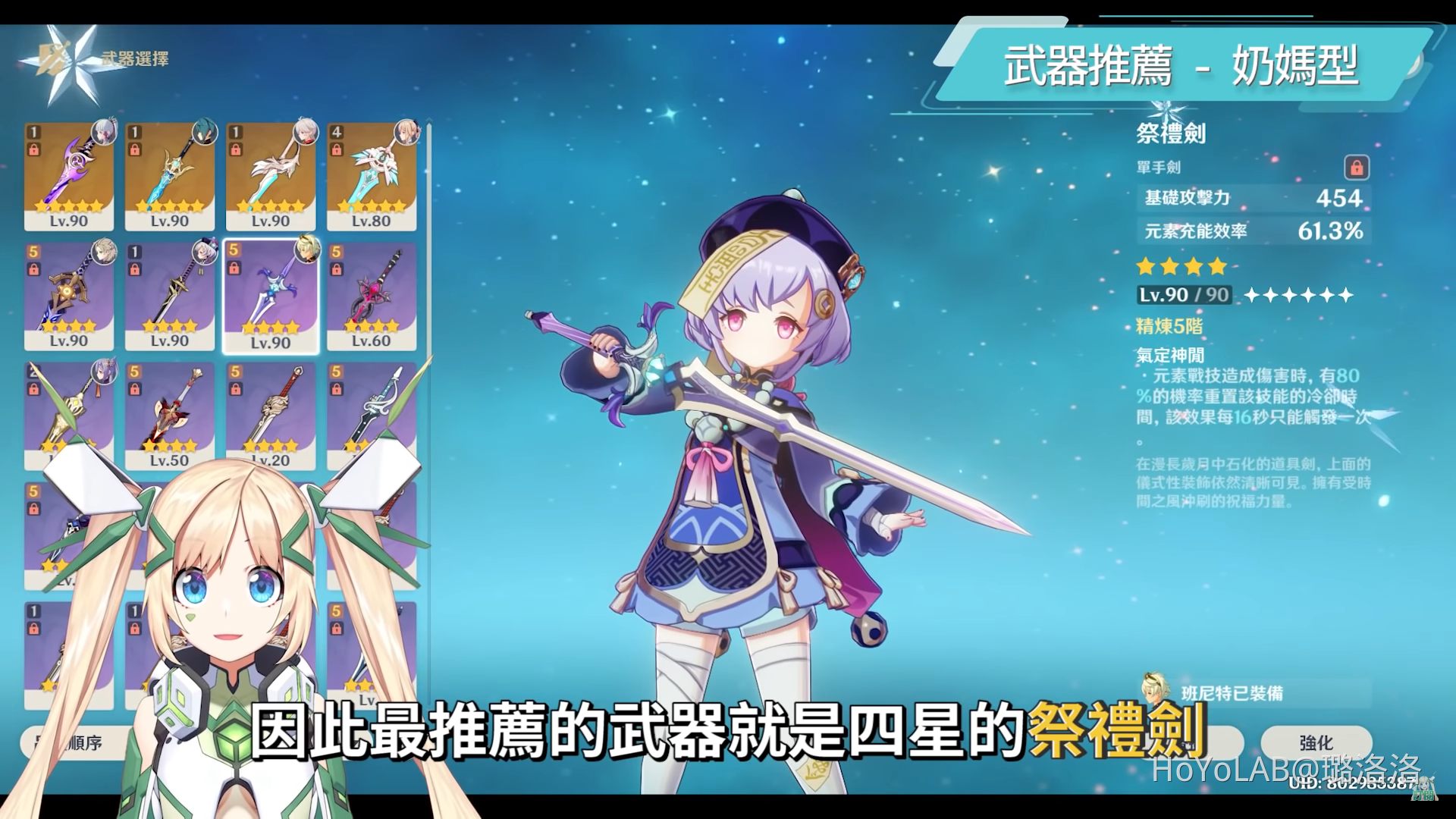 若是玩珍奶套的七七,前面提到的武器也都可以用,就看自己是考慮元素充能效率還是回復量,不過通常玩珍奶套的七七就是讓奶量越高越好,因此建議也是可以以攻擊力高白值的單手劍,或是提升攻擊力%數相關的武器為主,洛洛這邊目前就比較喜歡用高精煉的天目影打刀,副屬性提升攻擊力%數外,被動也可以替七七回復元素能量,輸出、奶量和充能幾乎都能兼顧。