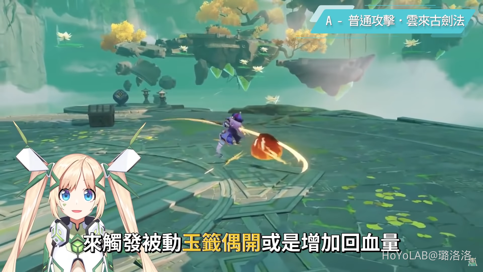 七七的普攻是五段的劍擊,普攻的攻速算是遊戲中單手劍角色中數一數二快的,只是倍率不高,不過重擊的倍率倒是還不錯,也比較容易觸發被動,因此若是想要用七七站場奶或輸出的話,也建議可以多用重擊的方式來觸發被動玉籤偶開或是增加回血量。