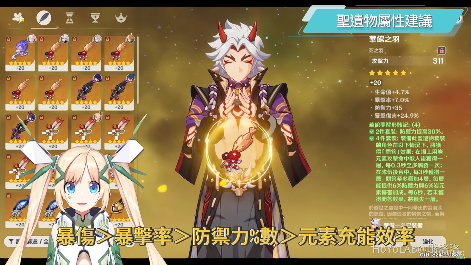 聖遺物屬性會推薦雙暴為主的禮之冠、防禦力%數的時之砂、岩元素傷害加成的空之杯,副屬性選擇的部分暴傷>暴擊率>防禦力%數>元素充能效率,畢業面板參考,防禦力至少2000以上,暴擊率至少60~70%,暴傷160%以上,暴率條件達成後暴傷越高越好。