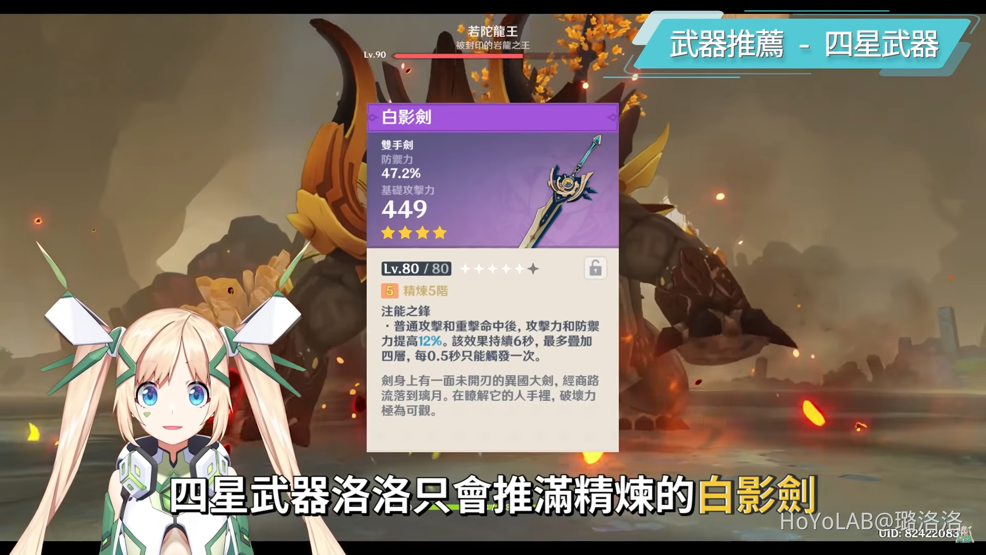 四星武器洛洛只會推滿精煉的白影劍和螭骨劍,若是萌新剛入坑還沒有很多原胚也沒關係,總之就是往這兩把的方向去衝,白影劍只要有原胚可以在鐵匠鋪免費打造,便宜又好用,雖然外觀跟一斗沒有那麼搭配,但是開Q之後就像關了燈一樣什麼樣子都看不見了,傷害量也不錯,而螭骨劍在同滿精煉且疊滿層數的情況下會比白影劍的傷害要高,且紀行武器課了就有,不過就是要暖機疊層數,層數疊滿5層要站場20秒,而且中間不能受傷否則層數會扣,又最好搭配護盾角,洛洛自己在實戰的時候雖然會讓一斗站場但也不會站到那麼久,等到站到疊滿層數的時候早就要切人了,所以自己覺得沒有很實用,傷害量有數據比較也只和白影劍大約差5000而已,以穩定且不用暖機的情況下來說還是滿精煉白影劍更好,加上一斗本身突破就加暴擊率,螭骨劍也提供暴擊率,拿去換成白影劍的防禦力%數加成會更好。