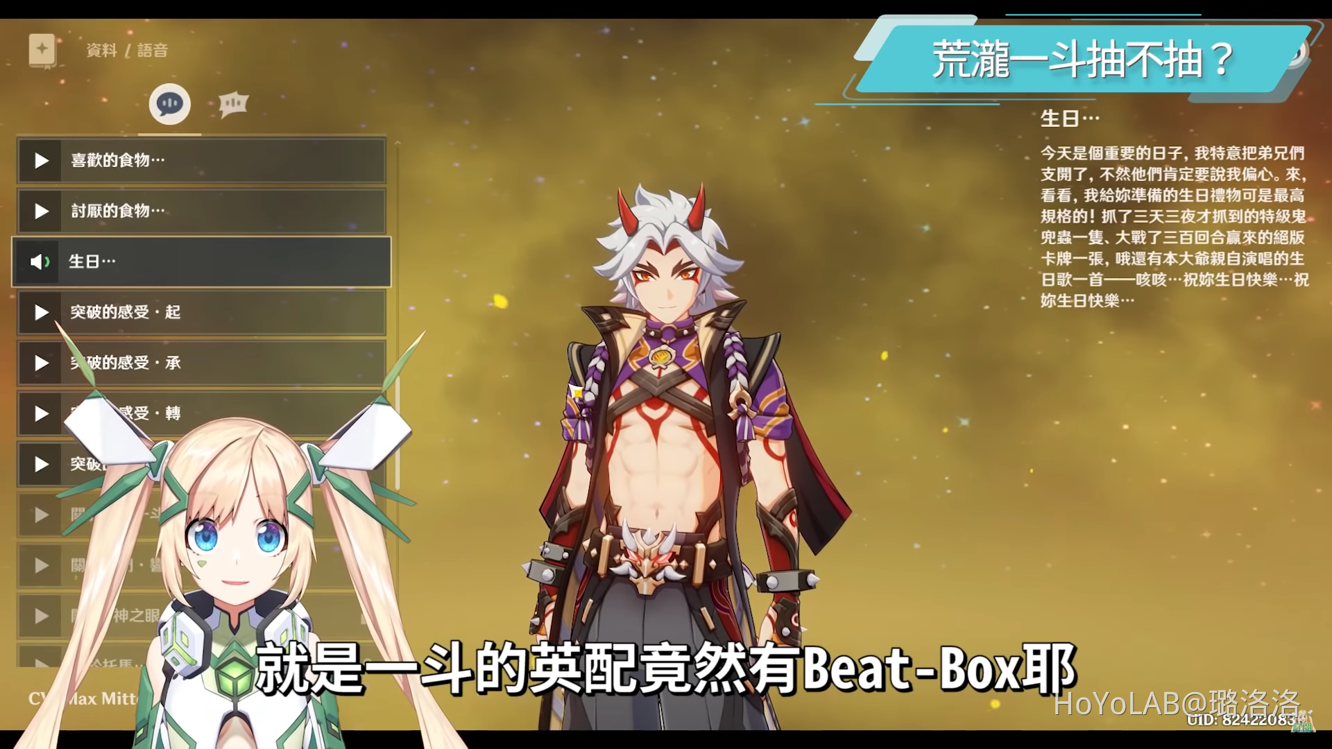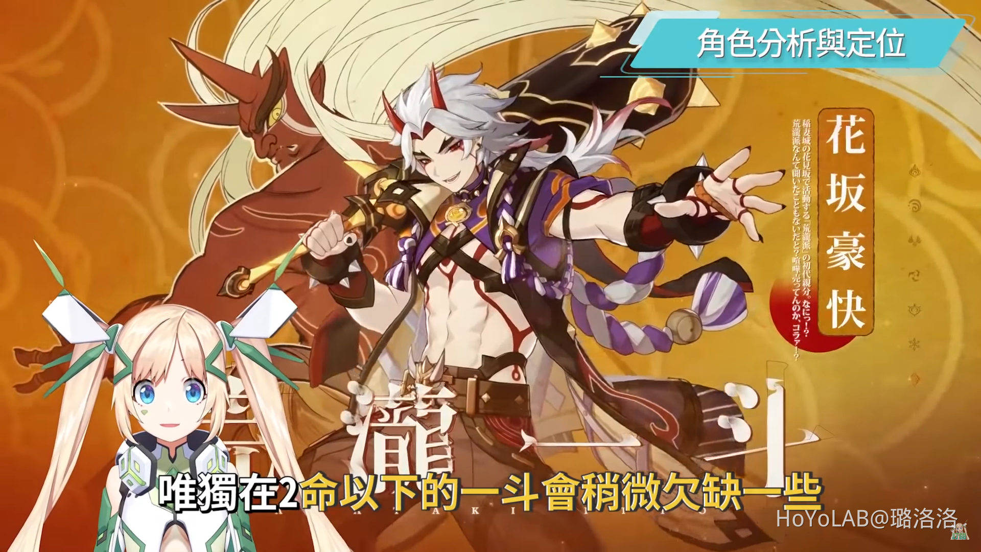 洛洛在實際試用過荒瀧一斗後,可以體驗到他具備五星角一定的強度,而且0命就能用,輸出傷害也很不錯,命座大概抽到2命也就差不多將近畢業了,抽完2命後可以再考慮是不是要抽赤角大劍外觀畢業或是往上補命座提升其他的輸出上限,另外也要提醒考慮抽一斗的肉肉們,一斗雖然傷害高但畢竟是岩元素角色,而岩元素的配隊就如同前面所推薦,若你沒有最佳配隊甚至幾乎都沒有練的話,需要好好考慮清楚,因為岩元素本身就是比較孤立的屬性,但也因為孤立所以爆發傷害比其他元素高,不過這個爆發傷害也是一個穩定的平均值,比較不像其他元素傷害隊伍可以打幾十萬的核爆,可以在深境螺旋凹一些浮動的秒數空間,而且也沒有辦法吃到風元素的擴散,加上蠻建議你最好有阿貝多和鍾離,沒有抽一斗和五郎都還可以玩其他元素傷害的隊伍,像是搭配胡桃+行秋,或魈+砂糖的火或風元素隊伍也都十分實用,不練岩隊不會有什麼差距,只是你多了一個培養隊伍的選擇空間,且岩元素的另外一個優勢也是打什麼元素的怪都可以,雖然破盾都不快,但也不怕被克制,非常穩紮穩打的隊伍,最後一個也不知道算不算是缺點的缺點,就是大部分都是男性角色,推薦的隊伍幾乎都是大男隊,老婆黨可能會有其他考量,最後稍微小提一個洛洛覺得很驚豔的地方,就是一斗的英配竟然有Beat-Box,不得不說這次的聲優都很不錯,每個語系的聲優都有些微不同的感覺。