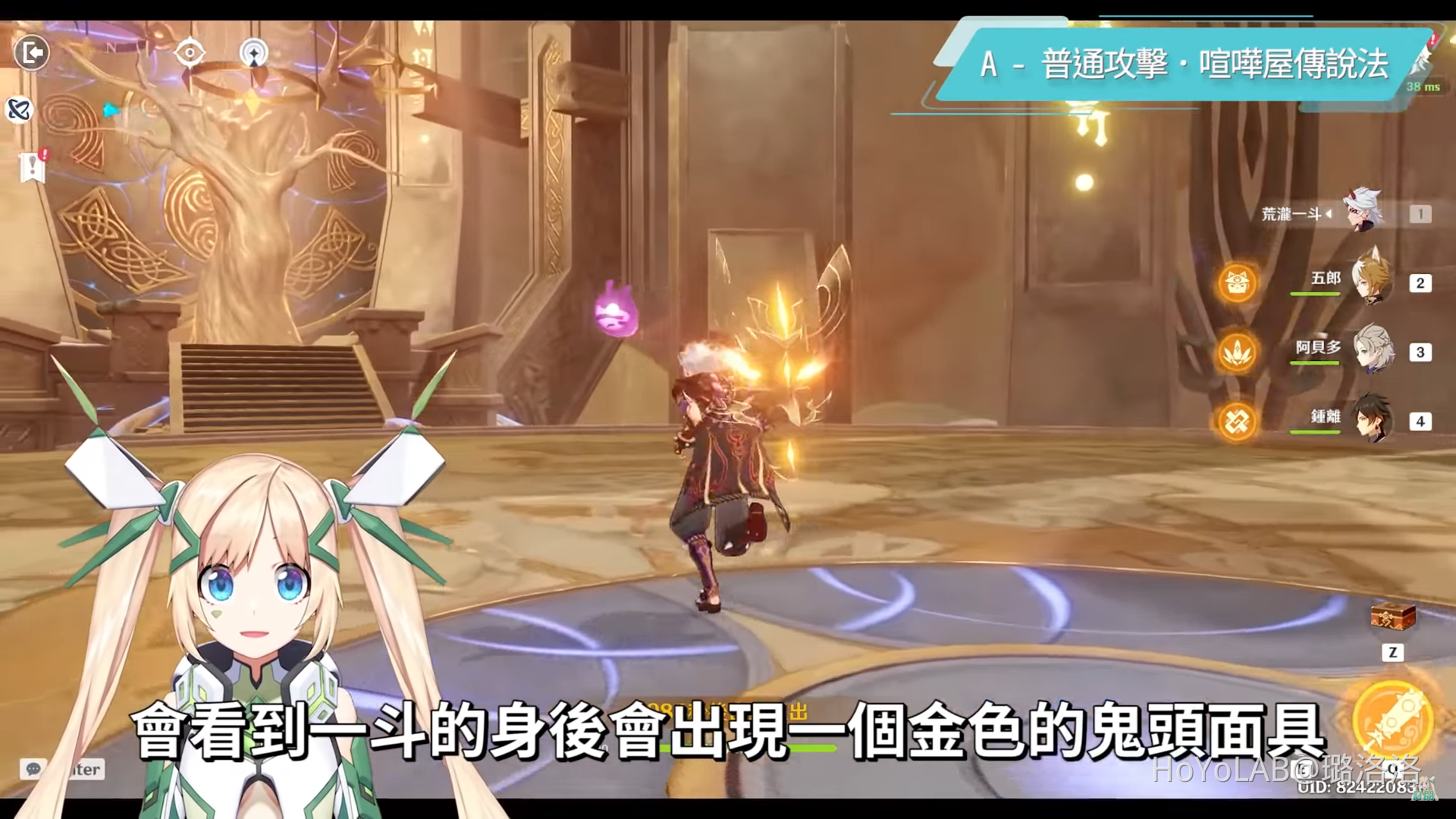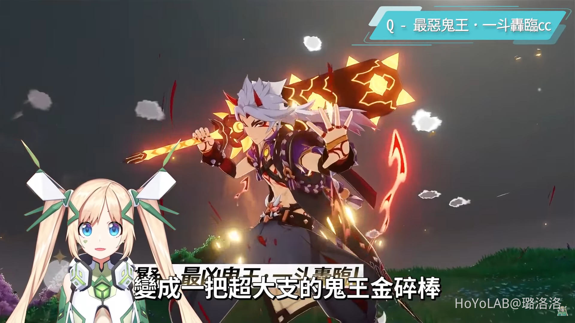 Q大招施放後一斗會轉化武器的外型變成一把超大支的鬼王金碎棒,這時候一斗的武器會類似雷電將軍一樣變化武器外型,所有的普攻和重擊也都會轉化為岩元素,並且也是一樣無法被任何元素附魔的狀態,因此Q大招狀態下的一斗,即便搭配滿命班尼特也不用擔心被轉為火屬性,此時攻擊速度提升10%,和諾艾爾Q大招一樣轉化防禦力作為攻擊力,每次攻擊的第一和三下也都可以疊加亂神之怪力層數,基本上搭配普攻的疊加機制的話,也就等於每一下都能夠疊加層數了,若是實戰中看不太清楚怪力面具的層數大概在第幾層的話,也可以再大概補個一兩下普攻確保滿層數就能接重擊連斬五下,也因為大招的狀態持續時間有11秒,即便一開Q後就揮滿五下,或是在沒任何疊層的狀態下就開Q,也都還是有很多的時間可以重新疊層疊到滿,基本上就是有Q就可以開,然後持續站場疊層打終結技。雖然開Q狀態下的一斗會有DEBUFF降低自身全抗性,但有護盾保護的話其實跟沒有DUBUFF一樣,比較會擔心的可能還是流血侵蝕的效果。