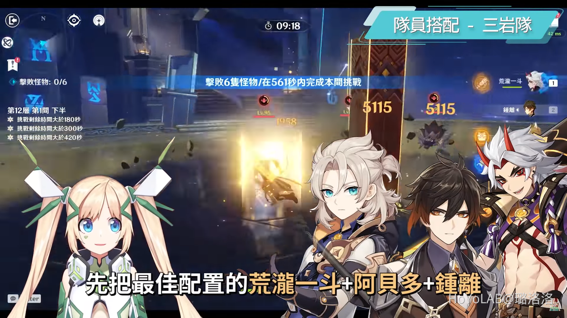 三岩隊的組成也是差不多,先把最佳配置的荒瀧一斗+阿貝多+鍾離看你有幾隻就放幾隻,阿貝多和鍾離若有缺少其中一隻的話,也可以放凝光打個傷害,喜歡岩主也可以,反正就有什麼放什麼,就是看自己的充能循環快不快而已,剩下一名角色可以是用來破盾、增傷、回血的功能輔助型角色,像是萬用的增傷奶*班尼特,滿命也OK,或是2命可增加攻速和拉血的琴團長,又或是可以放入泡影不會被戳破的莫娜,攜帶試作金珀也可以兼當奶*,真的很缺元素充能效率的話也可以放雷電將軍或是雷主。