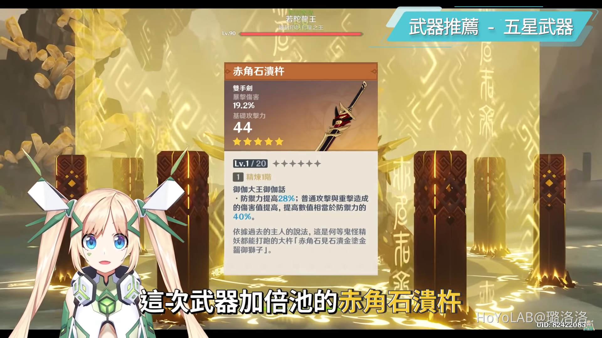 五星武器首推這次武器加倍池的赤角石潰杵,90等超高的暴傷加成88.2%,搭配一斗突破自加的暴擊率,輕鬆就可以達到漂亮面板,同時被動也是完全為岩系主C設計的防禦力%數加成,並且再基於防禦力去提升重擊和普攻的傷害,也可以讓滿命諾艾爾和滿命辛焱拿,但就是成本挺高。但精煉1的赤角石潰杵其實和滿精煉的螭骨劍或是白影劍差不了太多,若是平民的話也可以用後面推薦的四星武器。其他五星武器都不太考慮,像是無工大劍會有溢出讓傷害變得更低,狼末也沒有後面的四星武器適合,另外也不要問說這把大劍適不適合優菈了,優菈完全不需要這把劍的被動。