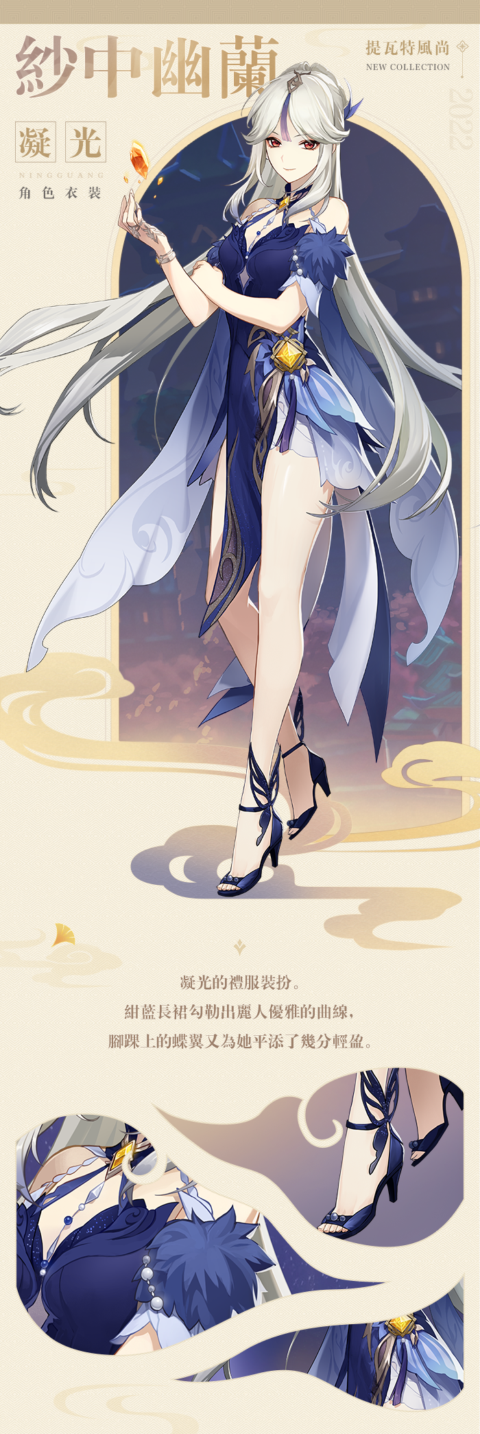 2.4版本中,旅行者可透過限時活動「飛彩鐫流年」免費獲得凝光衣裝「紗中幽蘭」。