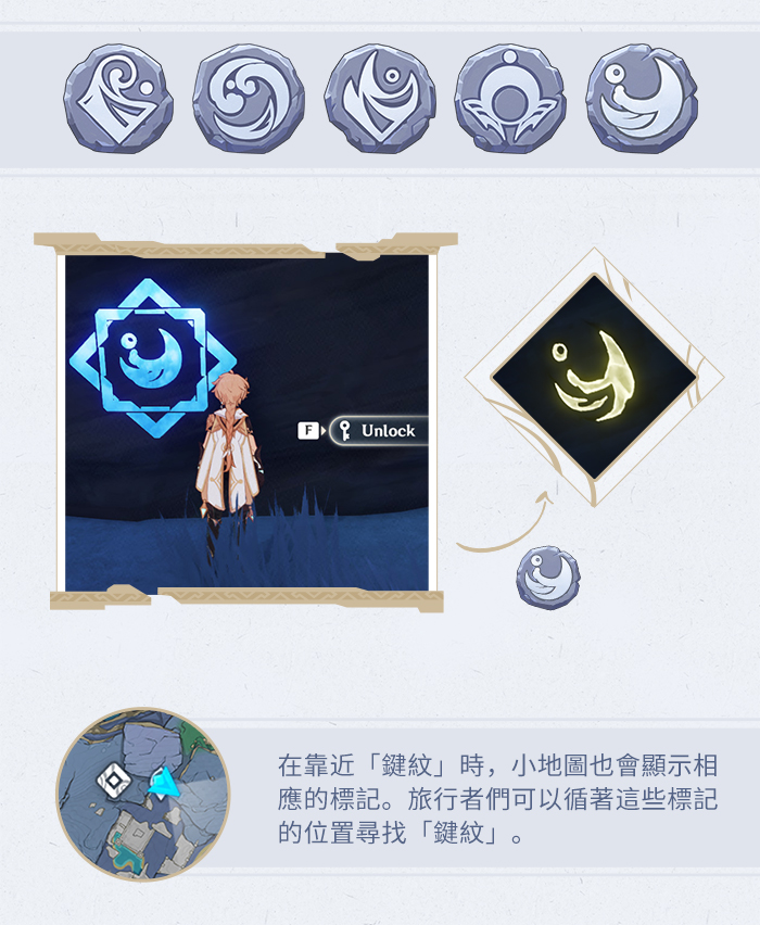 在淵下宮區域探索時,旅行者們可以搜尋到這種名為「鍵紋」的道具。這種被稱為「鍵紋」的圖案發源自淵下宮,共有五種。正如一把鑰匙開一把鎖,每一種類型的鍵紋可以解除對應圖案的封鎖。旅行者們在解鎖時要注意規劃這些「鑰匙」。