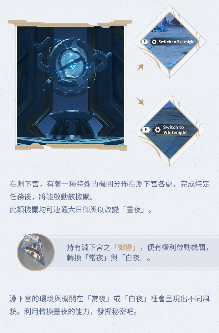淵下宮不見日光,因此並無日夜之分別。取而代之的是「白夜」與「常夜」之分。在淵下宮,有各類機關需要藉由改變「白夜」與「常夜」來啟動。
