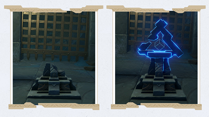 在淵下宮,還有著這種三角的機關。它是一種能在一定距離內以攻擊啟動的機關。一定時間後,該機關會重置。如果發現有的機關破損了,不妨在「常夜」狀態再看看。它們會自己補全。