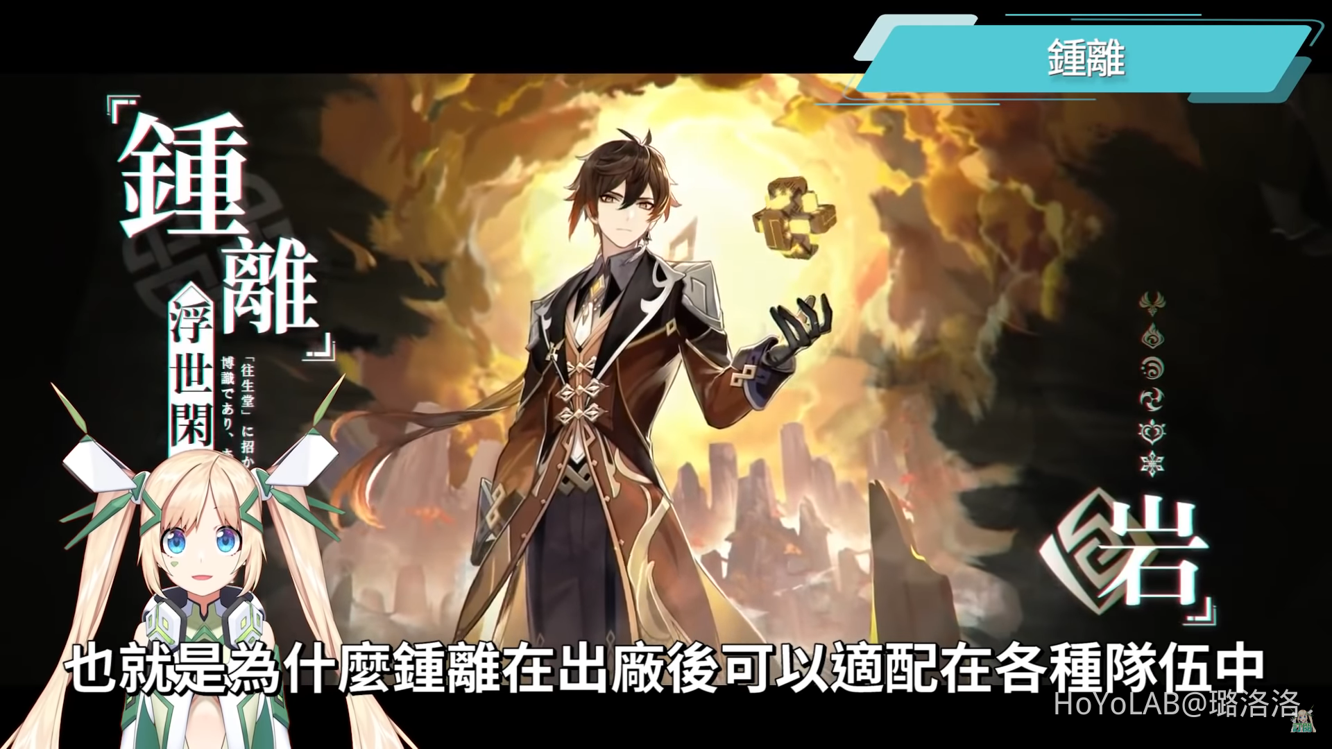 鍾離是岩系輔助,這次是第三次進限定卡池,在1.3版本過後進廠維修的鍾離,成為了人人必抽的卡,很多玩家都被鍾離養廢了,鍾離的護盾強效是全角色中最高,同時又有全角色獨有的全元素減抗和物理減抗,有看洛洛直播的玩家們都知道,只要看到XX元素減抗或是XX元素傷害增加這種效果的任何項目,都是很珍貴的BUFF,也就是為什麼鍾離在出廠後可以適配在各種隊伍中,成為大多數隊伍都可以帶的萬金油角色,其護盾的強效也可以用來應付對於新手來說很難對付的若陀龍王、女士這類比較難無傷的BOSS,深境螺旋、探索大世界以及導能原盤這類關卡,都可以大幅減少使用閃避、被擊飛、被打斷的機率。