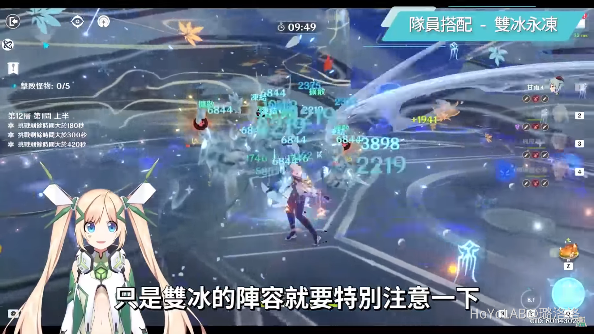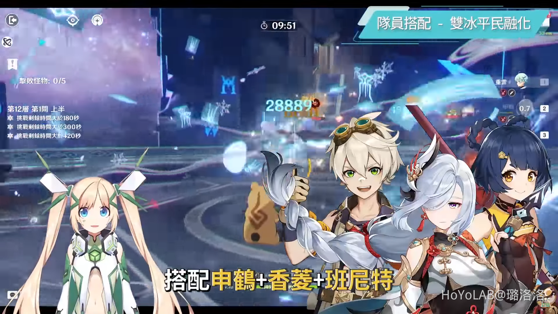 雙冰的組隊思路如同前面所說,隊伍中除了冰系主C,搭配冰系專輔申鶴以及萬用增傷輔萬葉,再搭配水元素工具人作永凍,只是雙冰的陣容就要特別注意一下大招循環的充能效率。