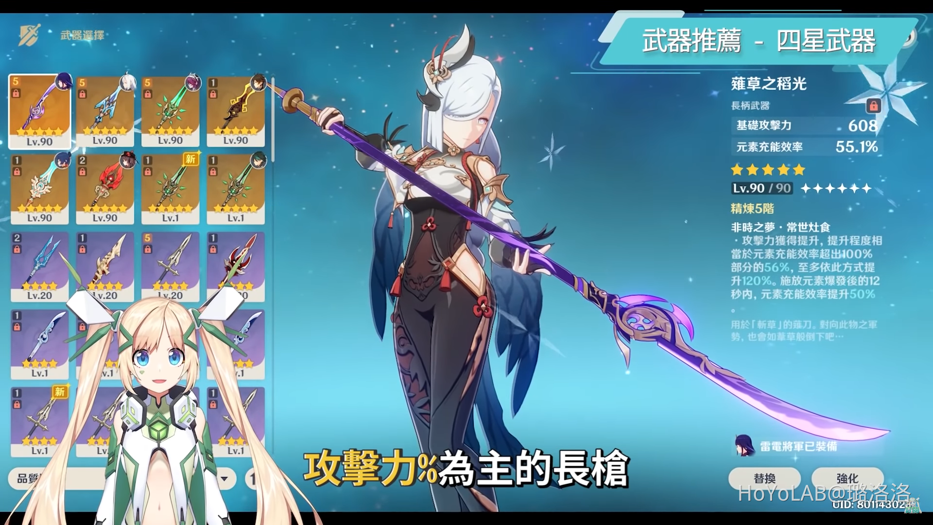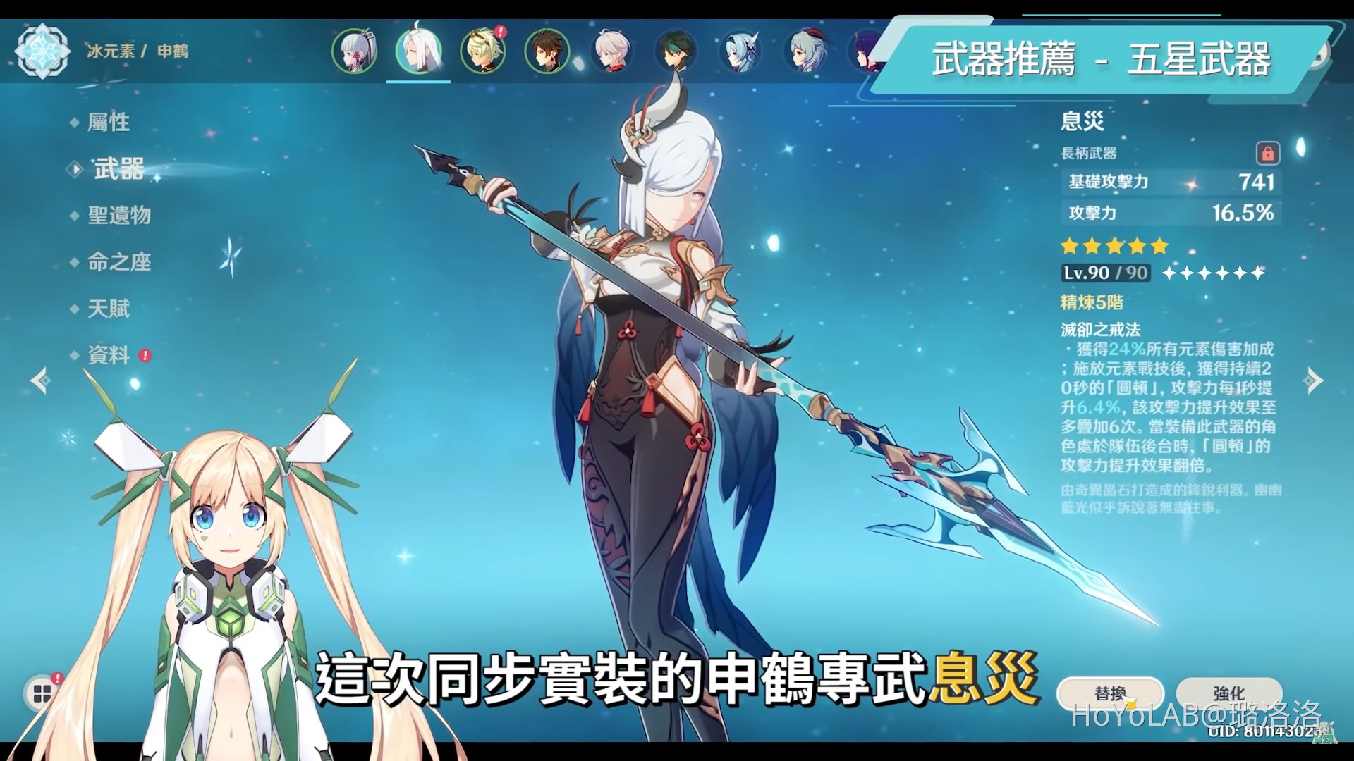 五星武器的部分首要推薦這次同步實裝的申鶴專武息災,申鶴的立繪也是拿這把,這把武器不僅是外觀畢業也是全方面為申鶴而設計的,副屬性提供申鶴最需要的攻擊力%數,被動也兼顧到申鶴輔助和副C作用的效果,可以獲得12%的全元素傷害加成,同時20秒內可以攻擊力%數提升,最高可以疊滿六次,處於後台狀態下攻擊力提升效果還翻倍,雖然被動效果十分香,但武器抽取成本也高,若是沒有辦法抽專武的話也可以選擇和璞鳶,被動效果也能夠提升攻擊力%數,最多疊加七層,同時副屬性提供的暴擊率也算實用,整體效果和息災大約差距10%左右,常駐池也有機會抽到,也算是可以考慮使用的武器,另外也還有另外一把增加攻擊力%數的五星長槍貫虹之槊,雖然護盾效果不算太實用,但主要就是要它的攻擊力%數加成和被動攻擊力%數的疊加,若是有搭配迪奧娜的護盾的話,攻擊力提升效果也會翻倍。總之在選擇武器方面盡量選擇以攻擊力%數加成的為主,其次可以選擇元素充能效率的為主,但就會有明顯落差。