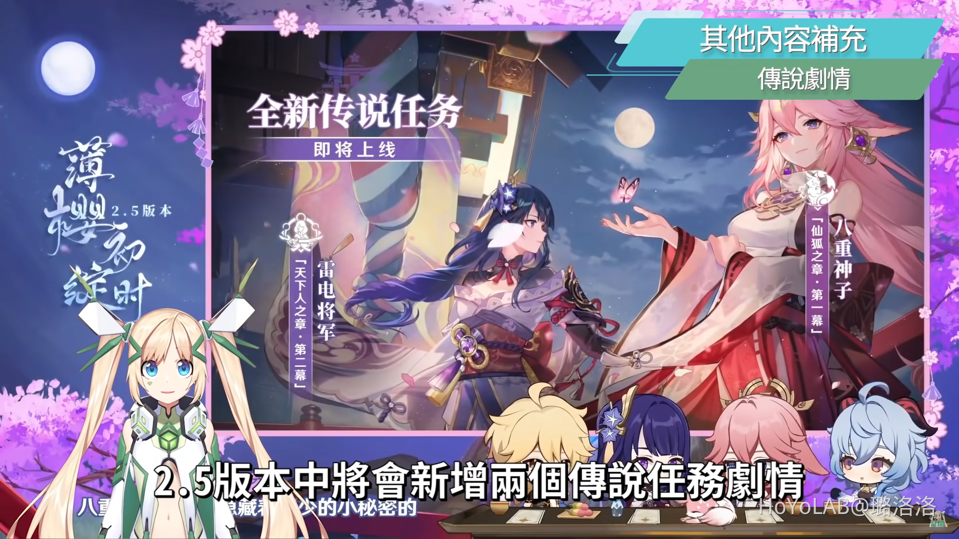 2.5版本中將會新增兩個傳說任務劇情,一個是雷電將軍的傳說任務「天下人之章」第二幕,一個是八重神子的傳說任務「仙狐之章」第一幕,要注意的是要先解完雷電將軍的傳說任務第二幕,才可以解鎖八重神子的傳說任務哦!我們將可以更瞭解稻妻的歷史、現在與未來,以及八重神子不為人知的其他秘密。
