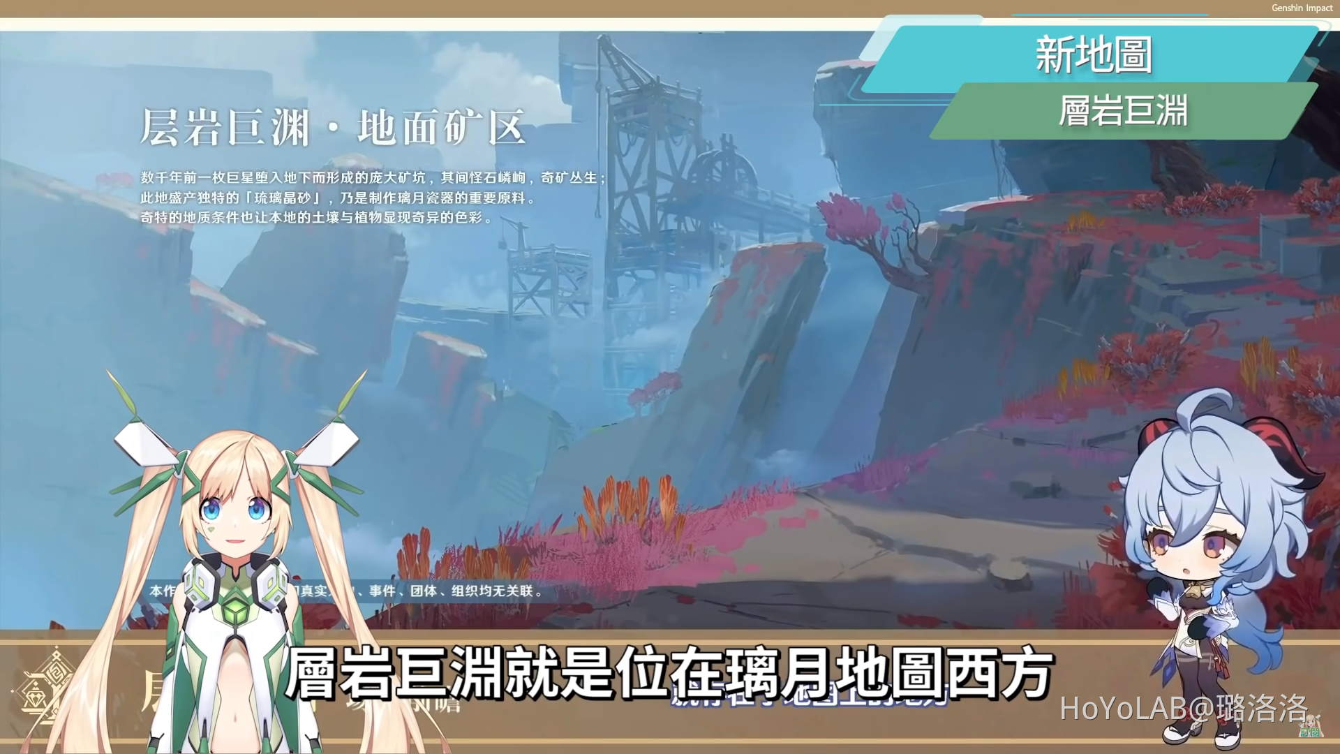 雖然這次是2.5前瞻直播,不過也提前亮相了關於2.6版本即將到來的新地圖:層岩巨淵。層岩巨淵就是位在璃月地圖西方有一塊尚未亮相但上方有名稱的未開放區域,即將在2.6版本釋出,這裡是鍾離和若陀龍王當初決戰的戰場,共分為地面礦區和地下礦洞,地面上盛產著特殊的「琉璃晶砂」,是用來做瓷器的重要材料,同時也有非常多奇特的礦種,地表有著許多顏色奇異的色彩分佈,而地下礦洞也有著豐富的礦藏,並且也因應地區特性而有著奇特的螢光植物。
