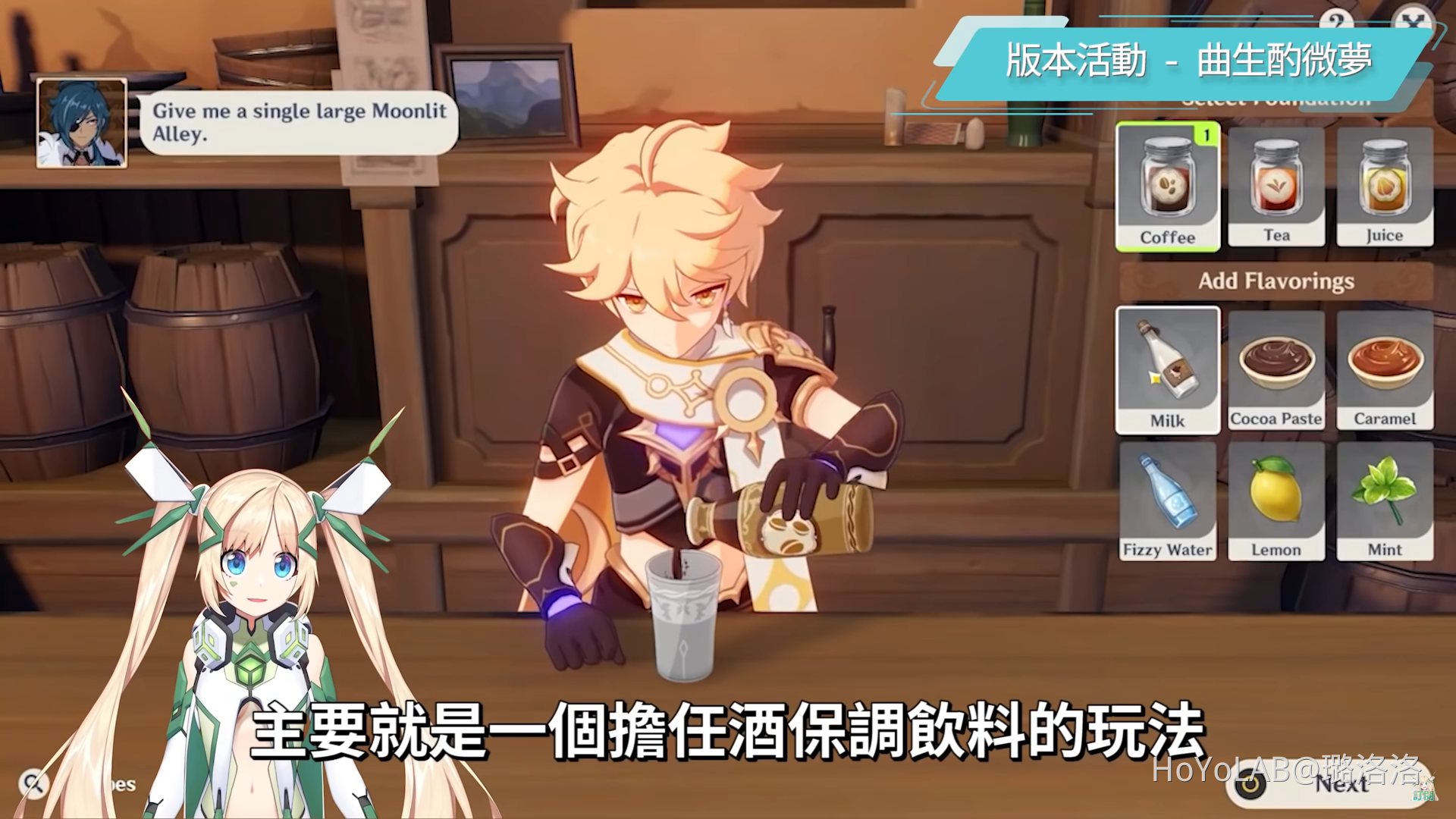 曲生酌微夢會需要我們到蒙德「天使的餽贈」酒館中進行,主要就是一個擔任酒保調飲料的玩法,看起來十分有趣,我們要根據客人的要求,選擇基底和配料來進行調配,隨著活動進度也會解鎖其他配方,而不同的飲品也有不同的攪拌方式,要倒多大杯也可以自己決定,同時活動中也會看到很多蒙德的老朋友唷。