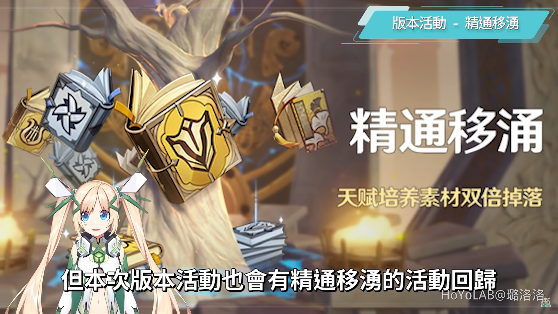 雖然直播中沒有展示,但本次版本活動也會有精通移湧的活動回歸,和之前地脈移湧一樣,每天三次花費原粹樹脂就可以獲得雙倍的天賦書材料。