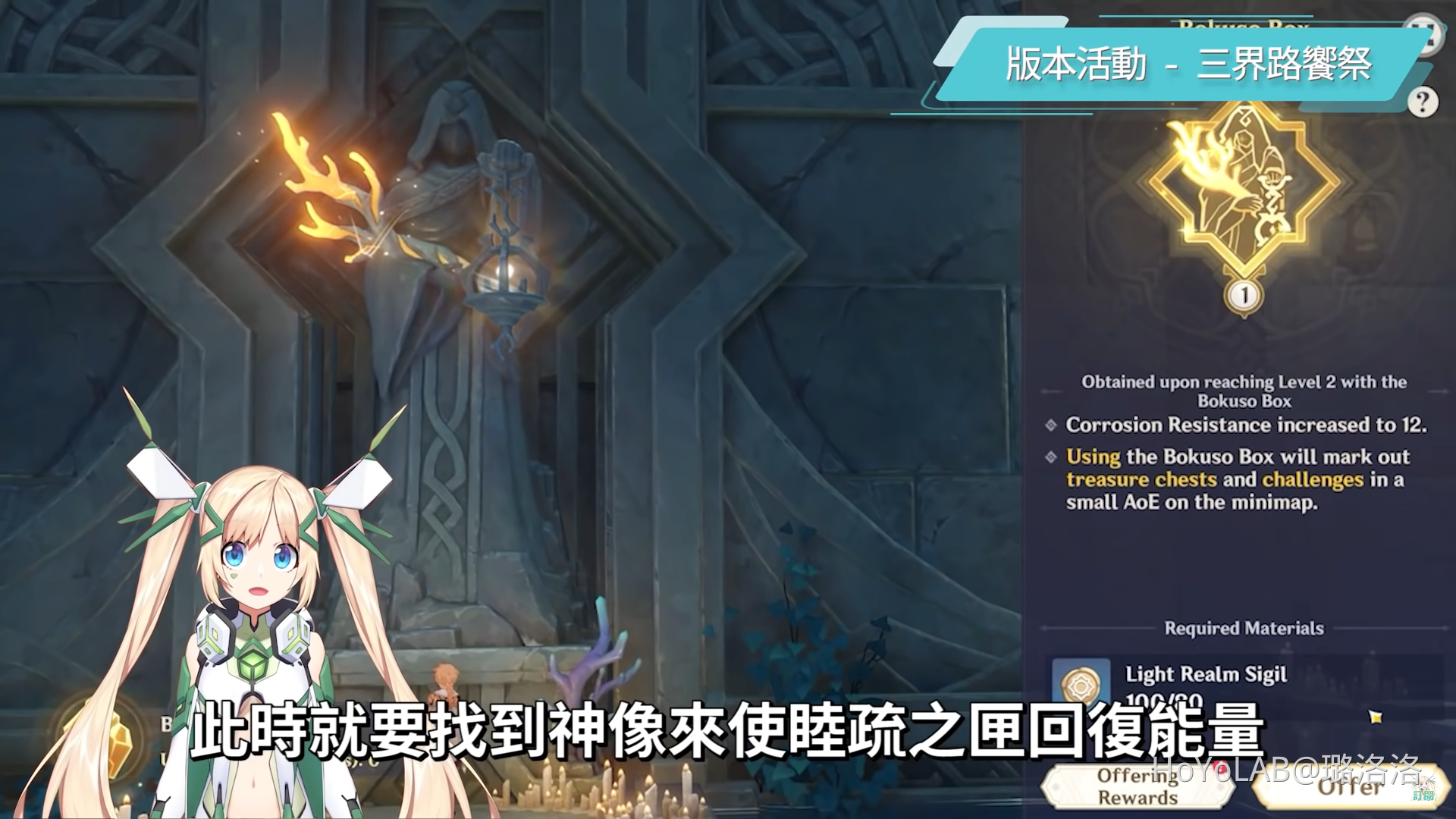 接下來是版本活動的部分,第一個版本活動是要再次前往探索更黑暗的淵下宮,也是首次活動結合探索的內容,因此若淵下宮還沒有探索完畢的話,可要加緊腳步,洛洛也會盡快補上淵下宮的解謎懶人包的。活動過程可以獲得一項名為「睦疏之匣」的道具,該道具可以抵抗黑暗的侵蝕,並在小地圖上標記一些活動所需物件的位置。但若是黑暗侵蝕使睦疏之匣能量歸零,將會無法擊敗地圖中的特定怪物,此時就要找到神像來使睦疏之匣回復能量,此外隨著活動解謎還能獲得「光界之影」,可以用來供奉神像讓睦疏之匣提升等級,當提升到一定等級,還可以在小地圖標記一定範圍內的寶箱。若是有找到華麗寶箱,打開後取得「光界之核」的道具的話,就可以讓角色使用「睦疏秘法」,強化角色的戰鬥和探索能力。活動完成就可以獲得限定免費四星法器證誓之明瞳和相關精煉突破素材。