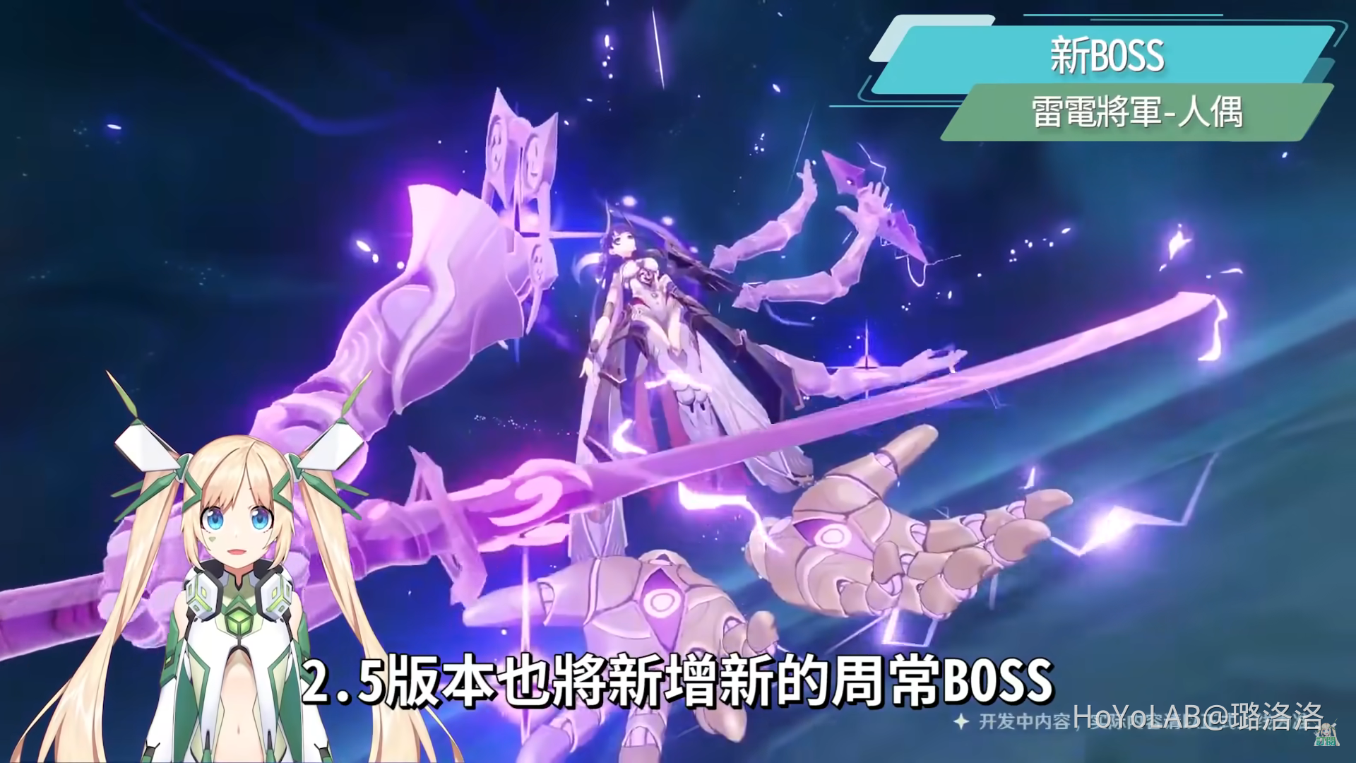 2.5版本也將新增新的周常BOSS,先前一些萌新們打得很辛苦的劇情雷電將軍,往後每個禮拜都要找他決鬥一次啦!從外觀和PV對話來看,我們將要挑戰的不會是雷電將軍本人,比較會像是原先代理雷電將軍處理稻妻事務的那位「人偶」,並且在關節的部分也可以看出有著人偶特有的圓球,技能組和難度上想必也會比女士要更加棘手纏人,這個BOSS按照過往應該也是要解完雷電將軍的傳說任務第二幕後才會解鎖入口,後續洛洛也會再準備相關的攻略影片。