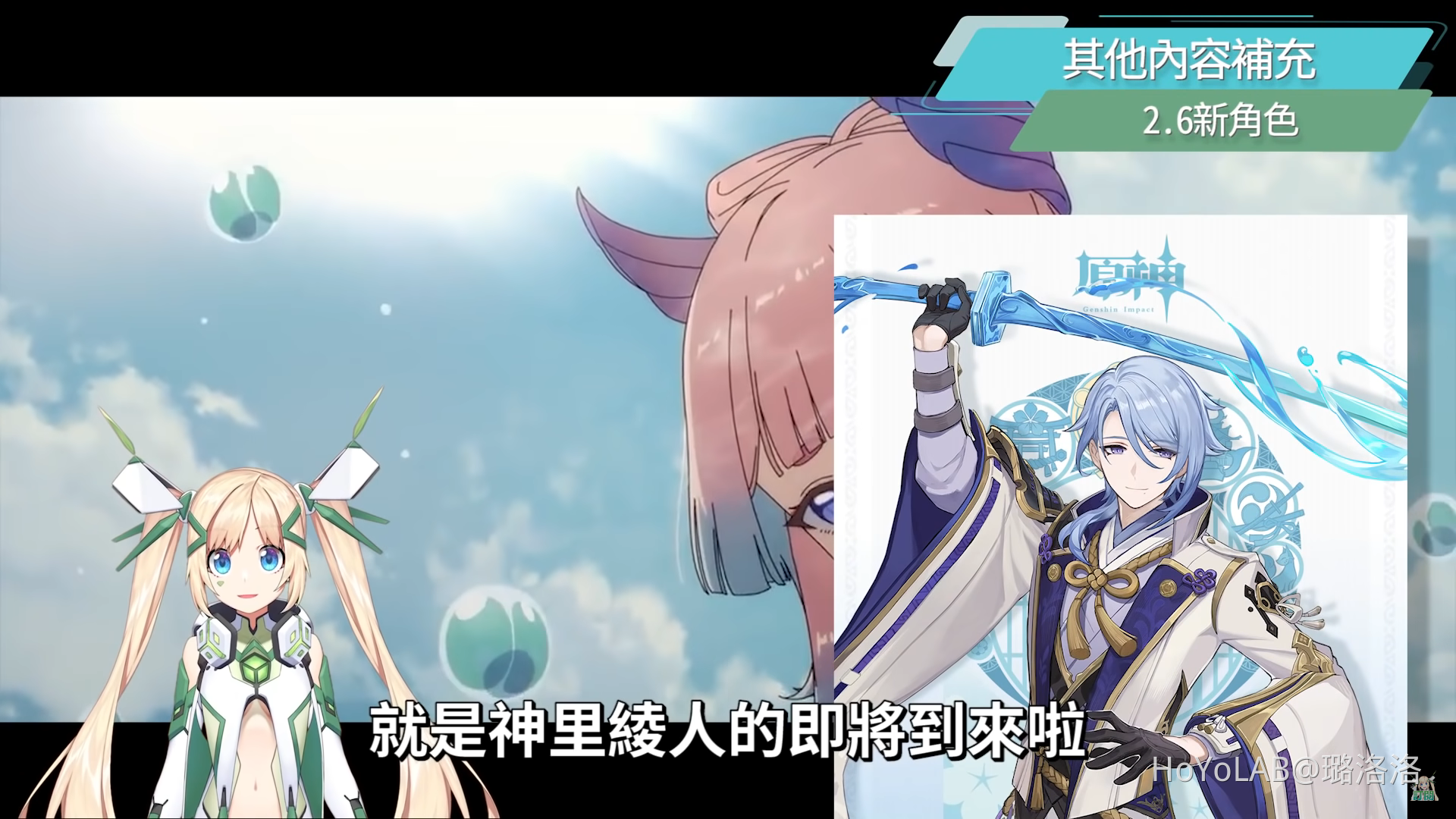 在直播中的官方宣傳PV裡,可以發現一個小彩蛋,在神里綾華的身旁出現了一位髮色相同的新角色,結合當天官方粉專同步發佈的新角色立繪,就是神里綾人即將到來啦,從立繪上可以看到手持單手劍以及水元素的神之眼,在2.6版本中我們應該就可以等到這位新五星角色的到來了吧!