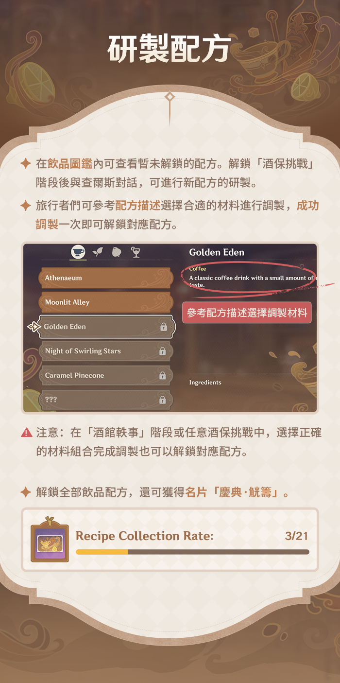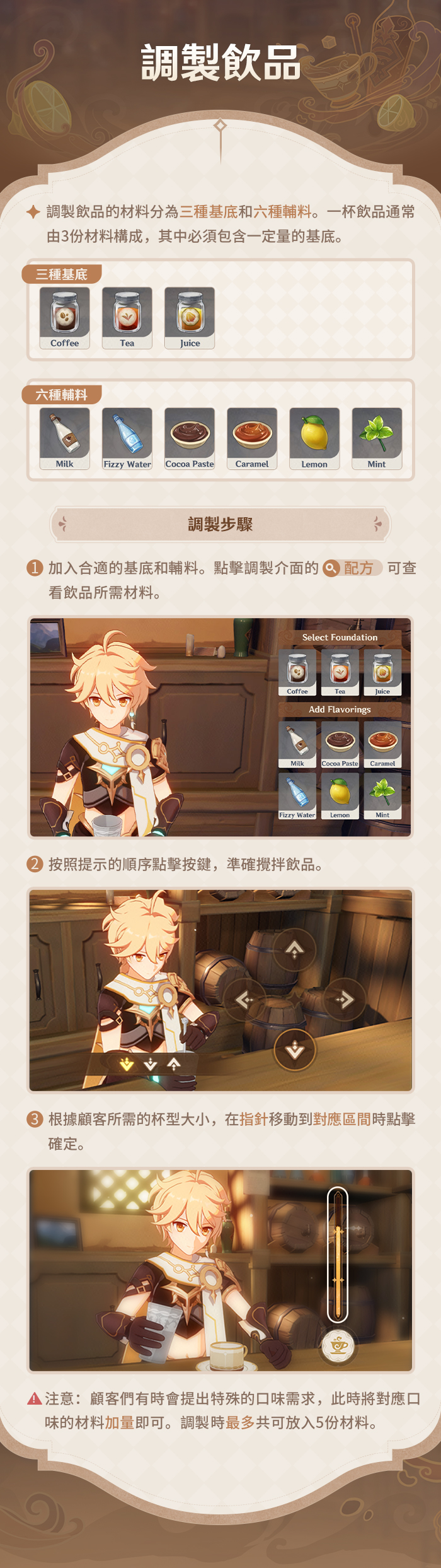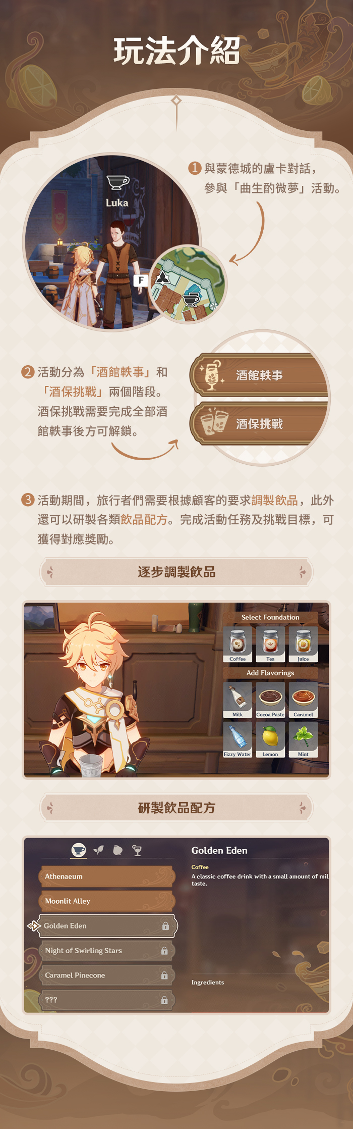 蒙德城的盧卡正在招募人員參加「酒保體驗週」活動,據說表現令顧客滿意的話,就能得到不錯的報酬…