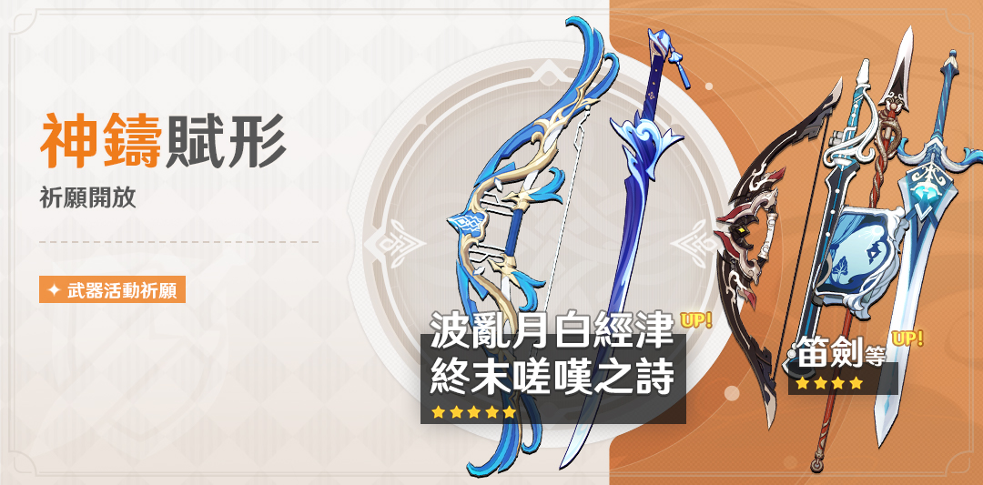 ●活動期間,可使用「神鑄定軌」對本期五星UP武器「單手劍·波亂月白經津」或「弓·終末嗟嘆之詩」進行定軌,更多「神鑄定軌」詳細規則可點擊祈願介面左下角【詳情】按鈕查詢。