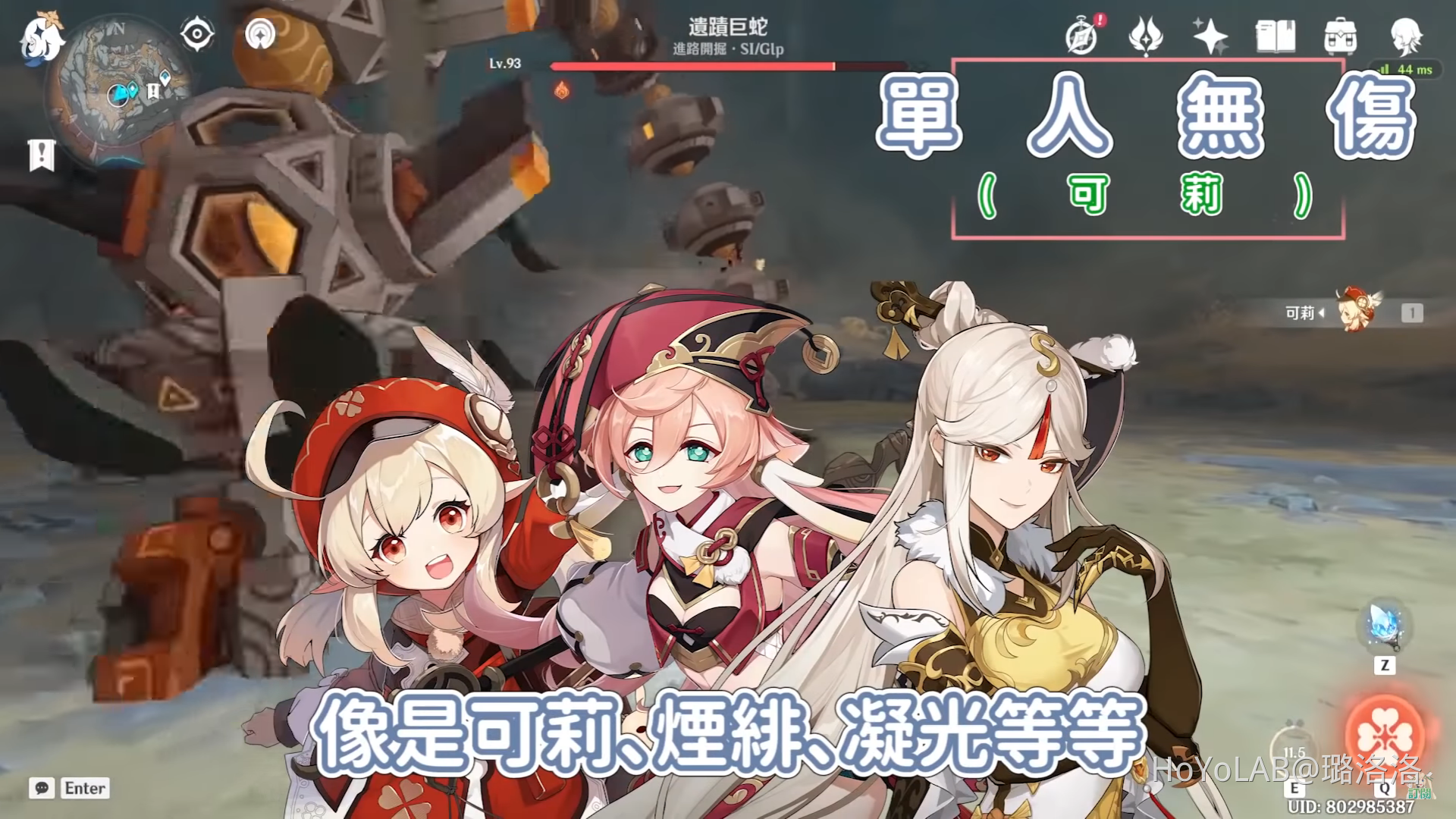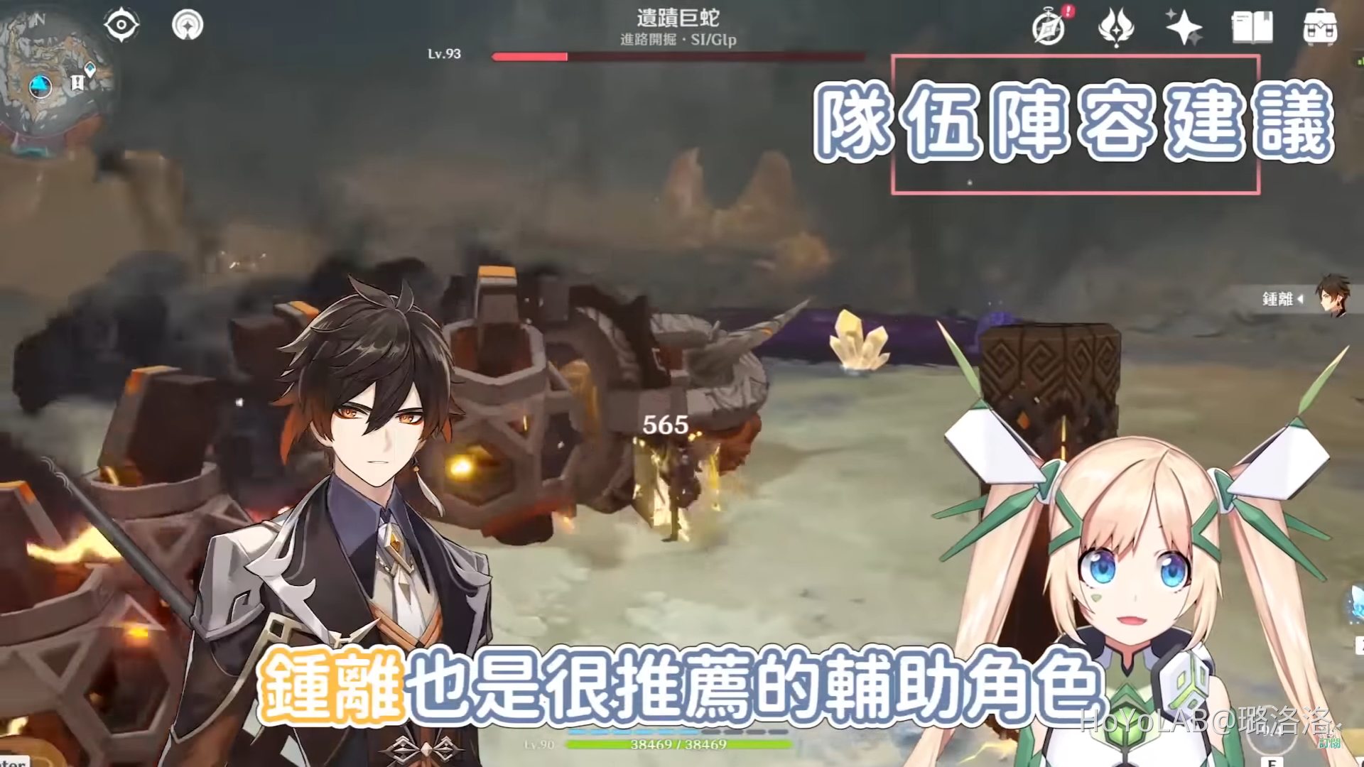 再來推薦一些不錯的角色,全元素的角色都適合用來作為輸出,首先是大劍系角色都很適合,此外是重擊可以擊破礦石的角色,像是可莉,都可以迅速擊破黃*結晶來回復能量,其次若是走位不夠好的話,鍾離也是很推薦的輔助角色,在巨蛇進行漩渦的攻擊時,鍾離可以站在岩脊上納涼,又或是搭配廢人式護盾讓你感受不到痛痛,而遺跡系列的怪物都是屬於物抗比較高的,所以盡量不要帶主力為物理輸出的角色,會打比較久。
