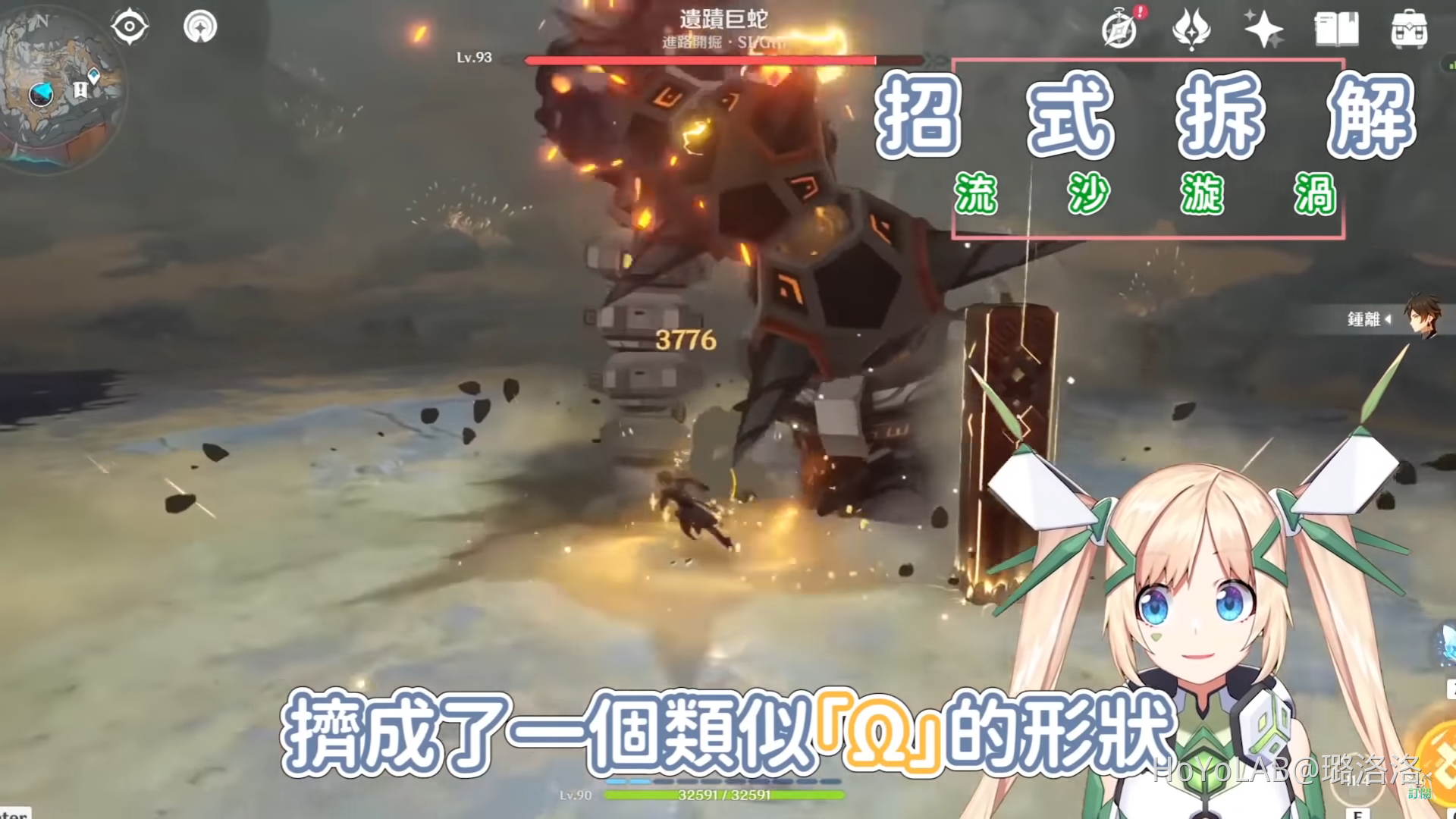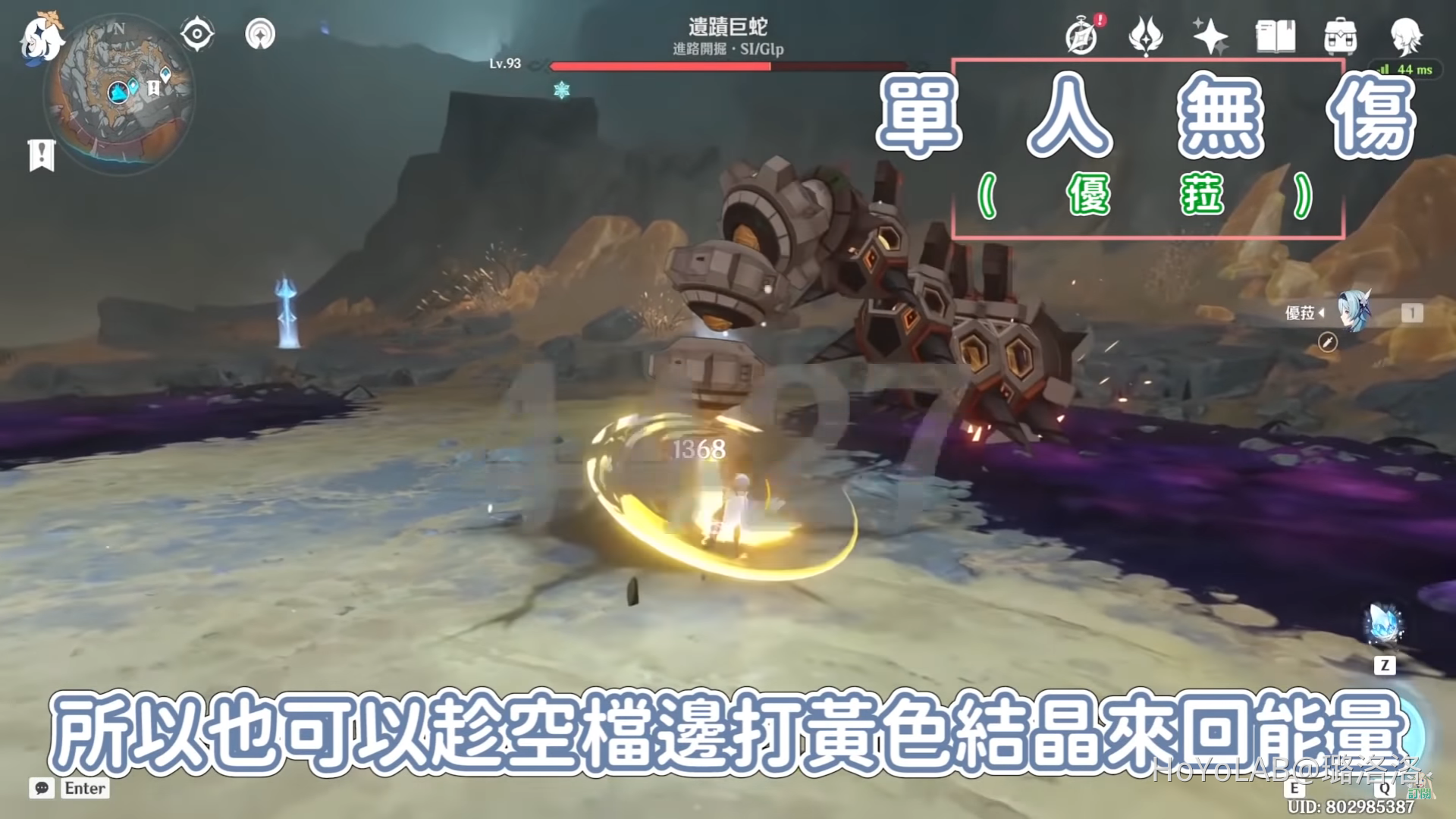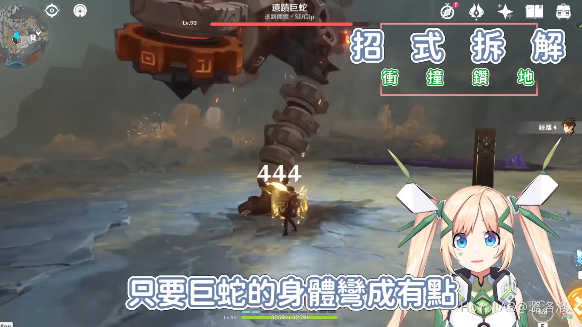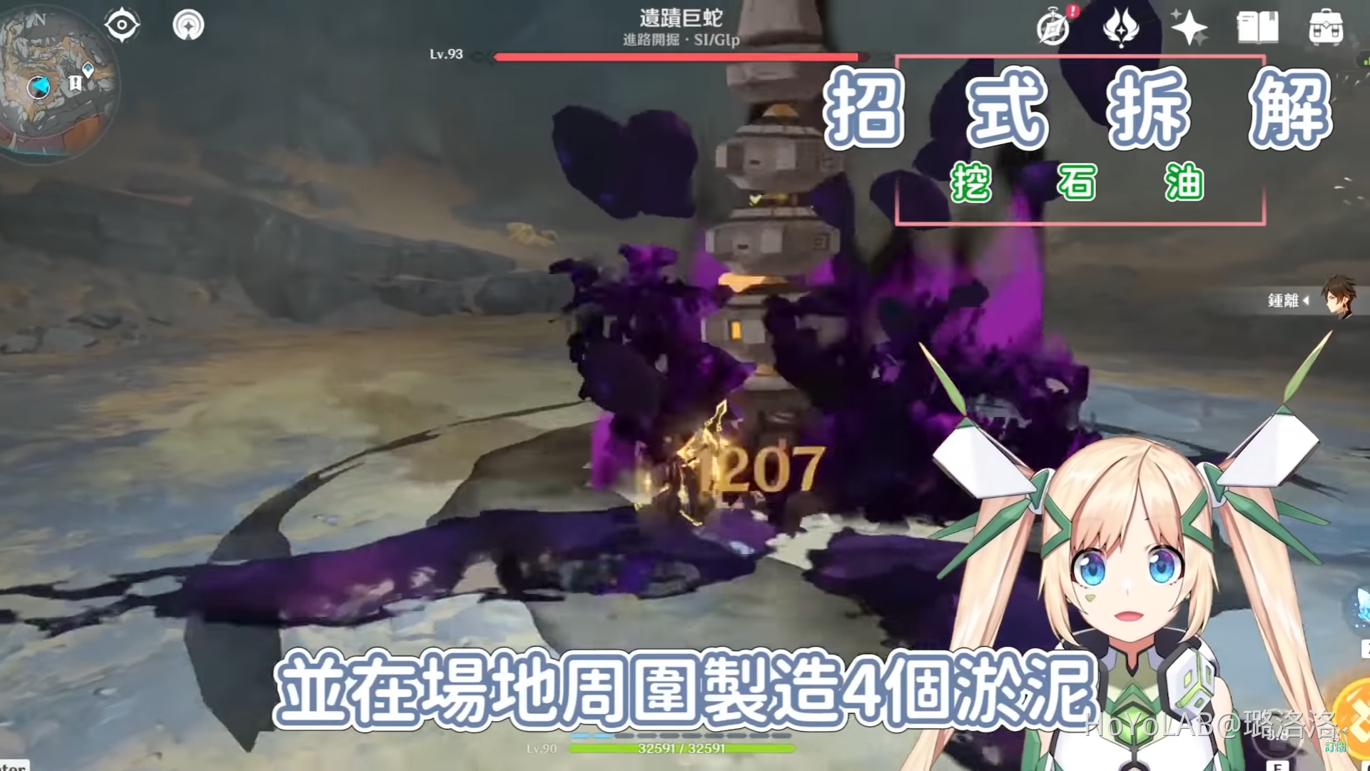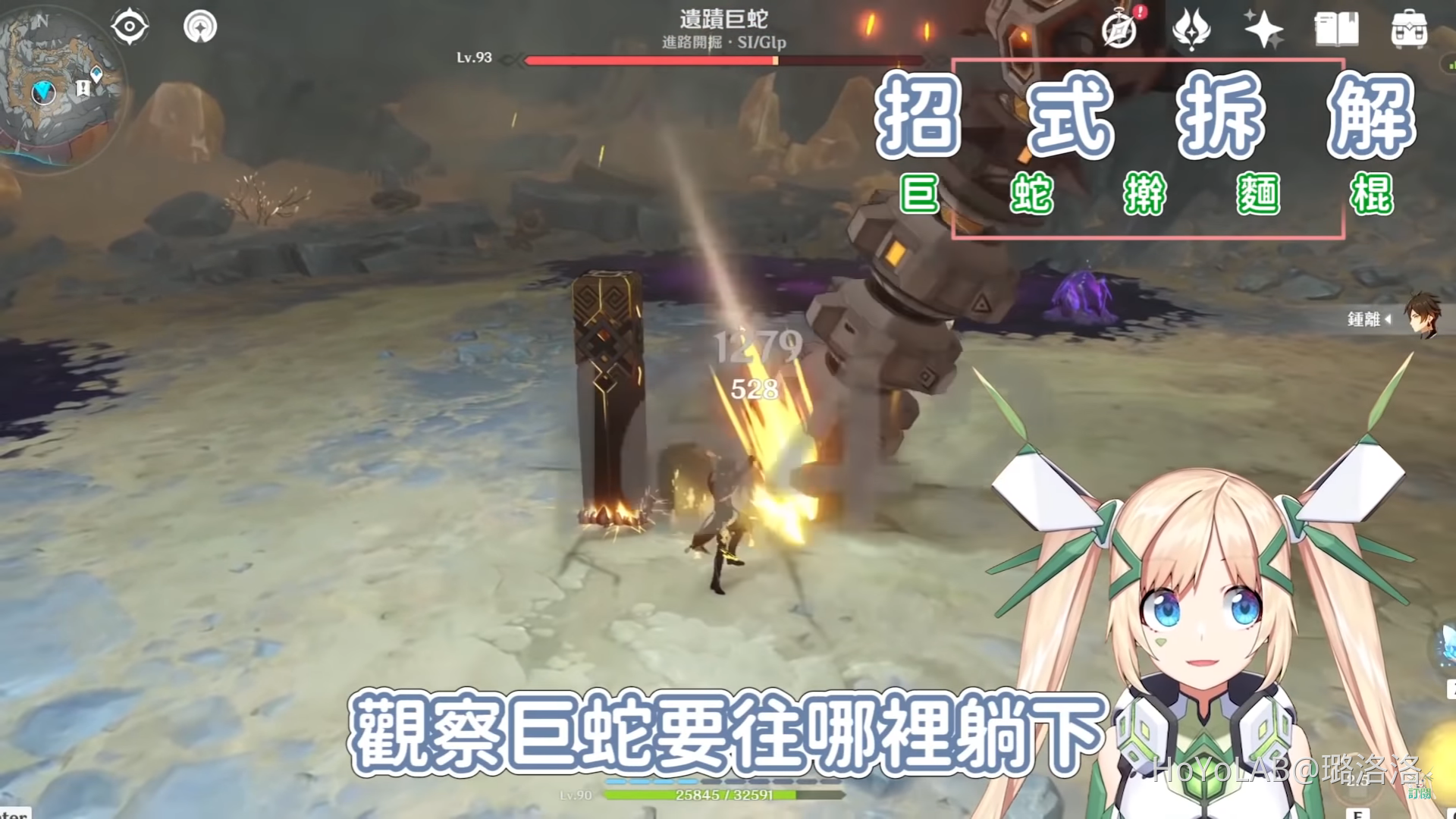 接下來帶來兩個比較簡單攻略的無傷實戰畫面,首先是大劍系角色優菈來做為第一局的馴獸師,前面吐石油前都可以抓時機進行輸出,稍微比較麻煩的是巨蛇會一直鑽地,要抓準巨蛇在地面露出身體的時機點進行攻擊,再來場地四周生成了4個淤泥和1個黃*結晶,而後觀察巨蛇出地面後的身體形狀,我們可以看到是「?」,就表示要使出衝撞鑽地,稍微往左邊引巨蛇往左邊鑽,再迅速往右衝刺躲避,等到巨蛇竄出地面後再拉開距離,這樣他尾巴刺入地面時就不會受傷,接著回到巨蛇的身體中心,也因為這時我們的觸媒是沒有能量的,所以也可以趁空檔邊打黃*結晶來回能量,同時觀察到巨蛇擺出了「!」的形狀,要使出擀麵棍攻擊,提前繞到他身後,等他擀完左右各一次後,又擺出了「Ω」的形狀,這時就要趕快遠離漩渦的範圍並等待,結果竟然被騙惹,趕快再拉回去輸出,後面就是巨蛇準備吸收淤泥能量的環節,在身上持有兩格以上能量時儘快清除2個淤泥,若是2個淤泥位置夠*也可以一次清除2個順便拿成就,隨後巨蛇就會進入癱瘓狀態,趁癱瘓狀態火力全開就可以順利結束了。