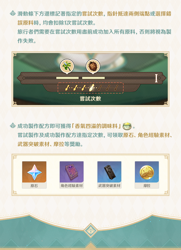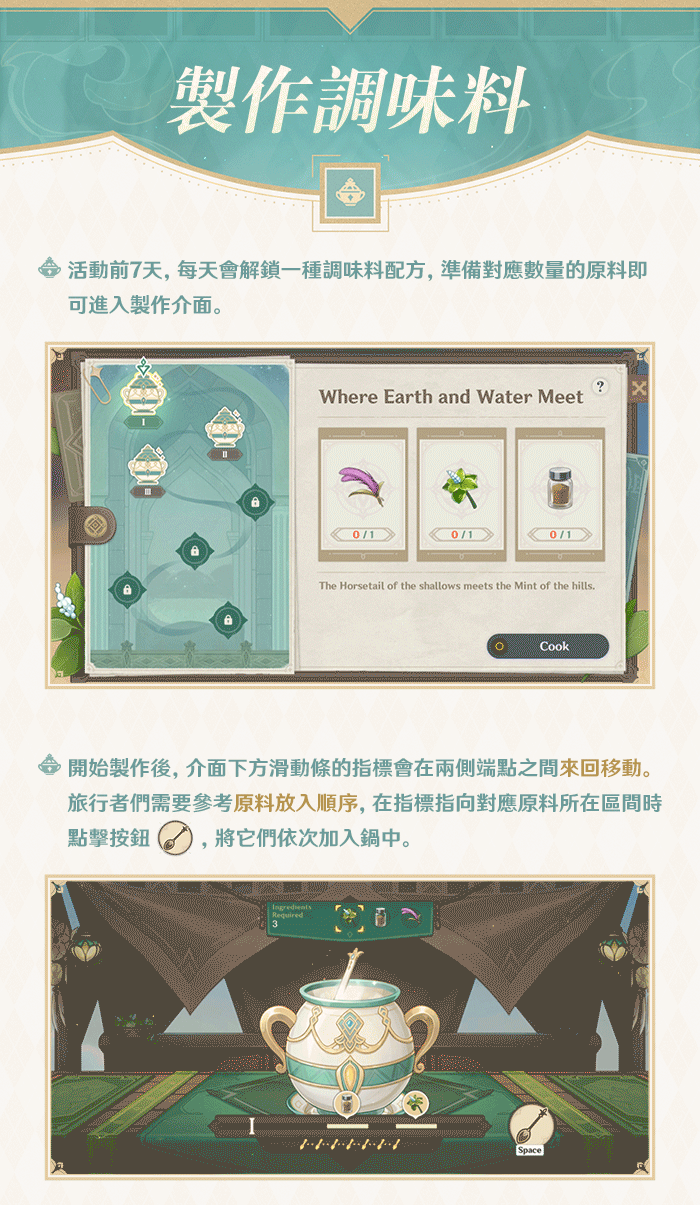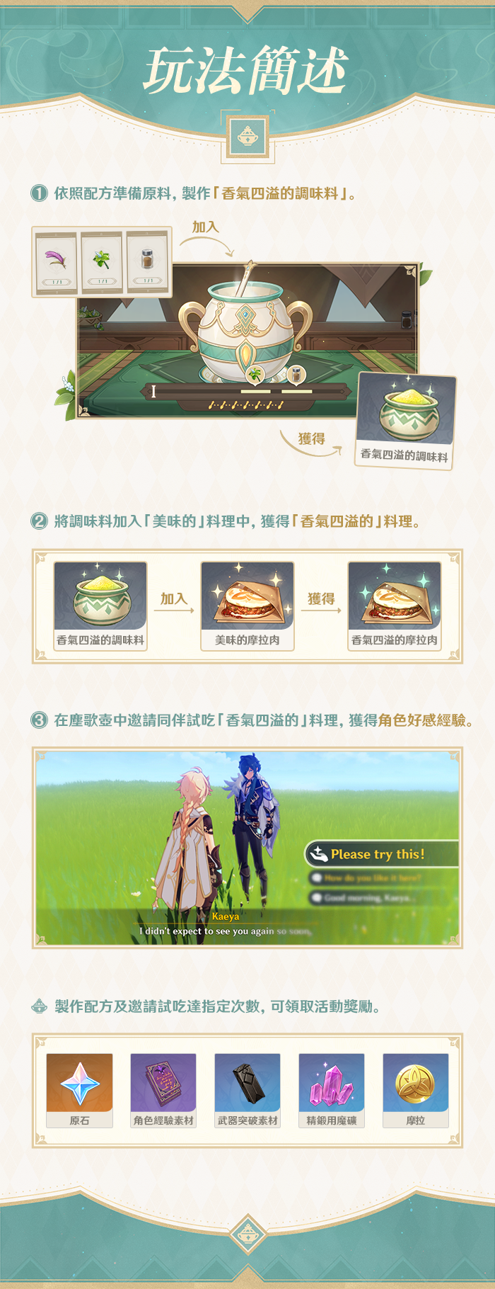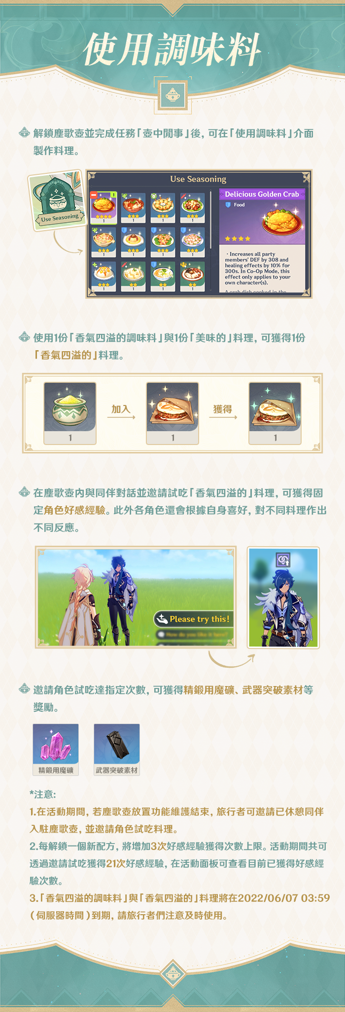 冒險等階≥28級且完成任務「壺中閒事」,可進行相應的料理製作並邀請角色試吃