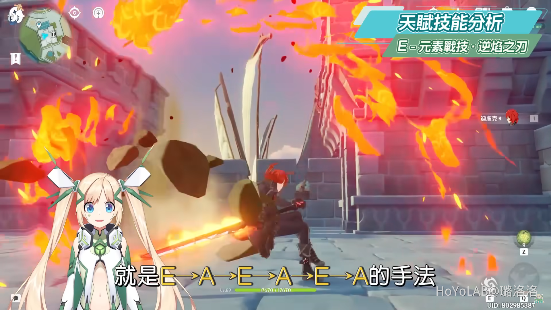 這邊再帶來常見的迪盧克輸出手法教學,玩迪盧克輸出時的重點,主要就是在於解鎖被動天賦2之後帶來全程Q大招火附魔常駐,因此起手為Q大招後→E→A→E→A→E→A,中間再切換其他角色做完反應和等待元素充能完畢就可以再做下一波的站場輸出循環。