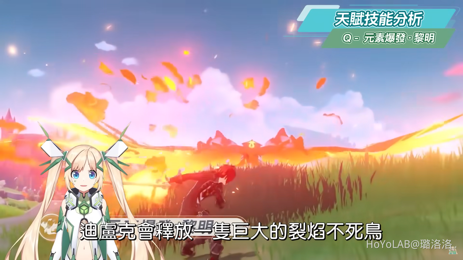 Q大招施放後,迪盧克會釋放一隻巨大的裂焰不死鳥,不死鳥會向前飛行並且對沿途上的敵人造成傷害,同時也具備擊退效果,而在不死鳥的終點爆裂盡頭還會造成大量的火元素範圍傷害,在施放Q大招後的迪盧克也會持有8秒的火元素附魔效果,在這段期間的所有普攻都將會是火元素傷害,冷卻時間12秒,時代的眼淚,在開荒時看到別人有迪盧克和施放這招元素爆發的時候,真的可以說是超帥的啊。