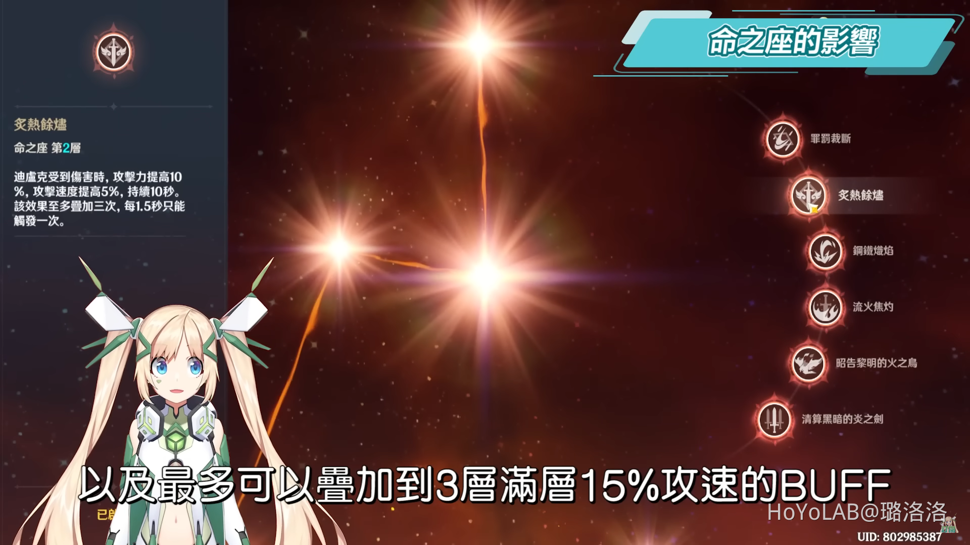 2命的迪盧克是在受到傷害時會提升攻擊力10%,以及最多可以疊加到3層滿層15%攻速的BUFF,持續10秒,也是提升輸出體驗的命座,也優化了大劍角色最不喜歡的笨重手感。