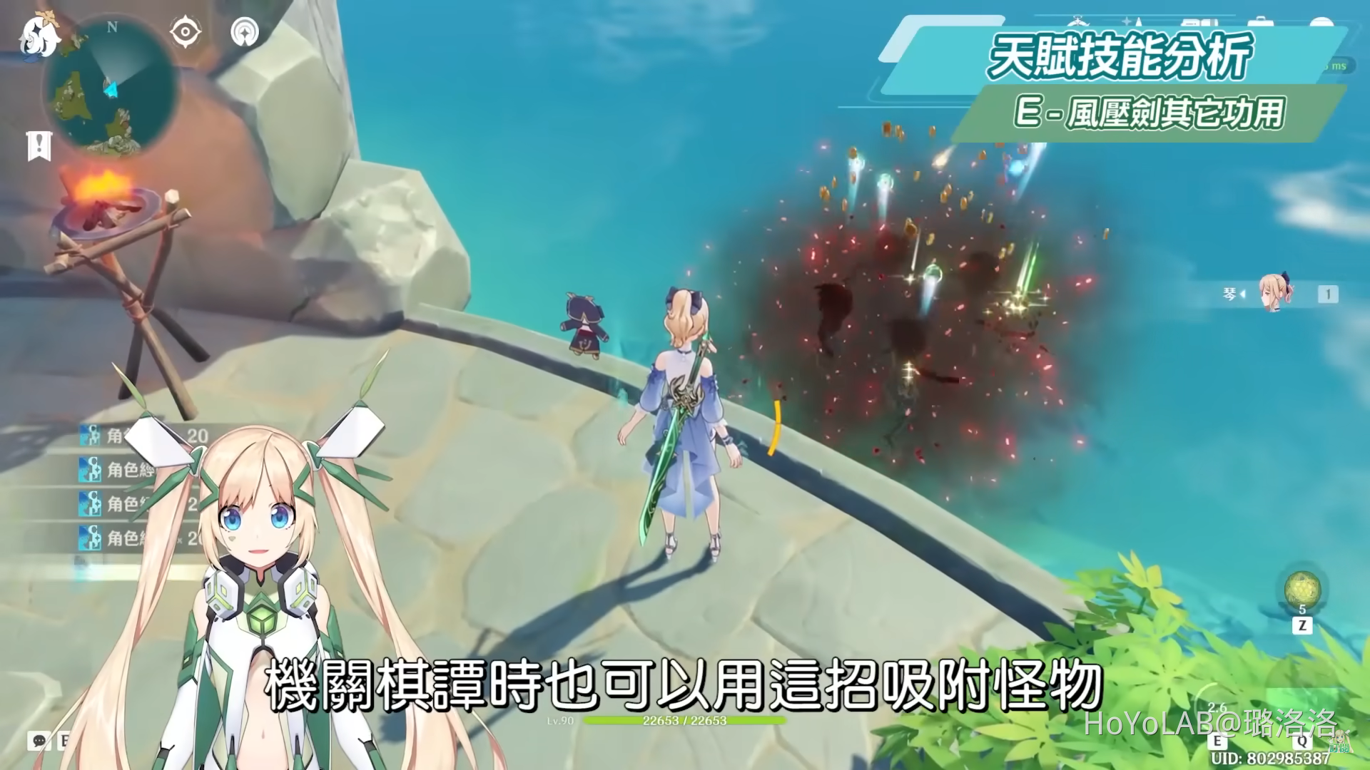 風壓劍在大世界探索時也可以把一些敵人吸附後拋到水裡直接讓怪物溺死,機關棋譚時也可以用這招吸附怪物將其拋到場地外直接掉落,或是拿來吸貓娛樂自己~總之E技能是個非常實用又具備輸出傷害的技能。若是想要接Combo的話也可以先用重擊挑飛怪物,讓怪物滯空,再用風壓劍吸附怪物拋出使其受到摔落傷害,再往前重擊挑飛怪物,中間若冷卻時間還沒好的話可以在怪物滯空時補個普攻或是繼續重擊再讓怪物滯空,如此的連續使用技巧。而此外若遇到深境螺旋中開盾頻率超高的冰瑩術士,也可以用這樣的連技弄到他連盾都開不了,甚至就這樣被摔傷給摔死,十分好用。