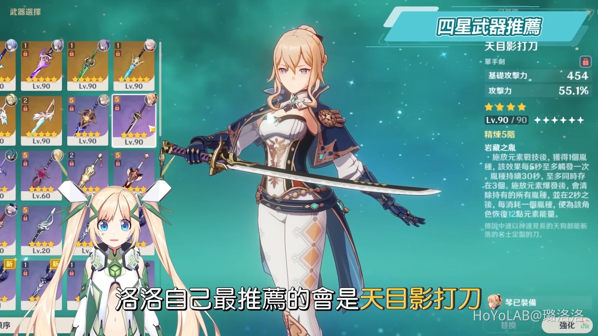 四星武器的部分,洛洛自己最推薦的會是天目影打刀,在主屬性提供琴需要的攻擊力%數屬性下,被動也可以兼顧元素充能的效果,加上鐵匠鋪就可以拿原胚免費打造到滿精煉,而其他單手劍選擇也很多,主屬性暴率為主的有黑劍、攻擊力%數為主有笛劍、元素充能效率為主的有西風劍、祭禮劍、腐殖之劍等等,基本上只要戰鬥中夠用的情況下真的都可以隨便用。