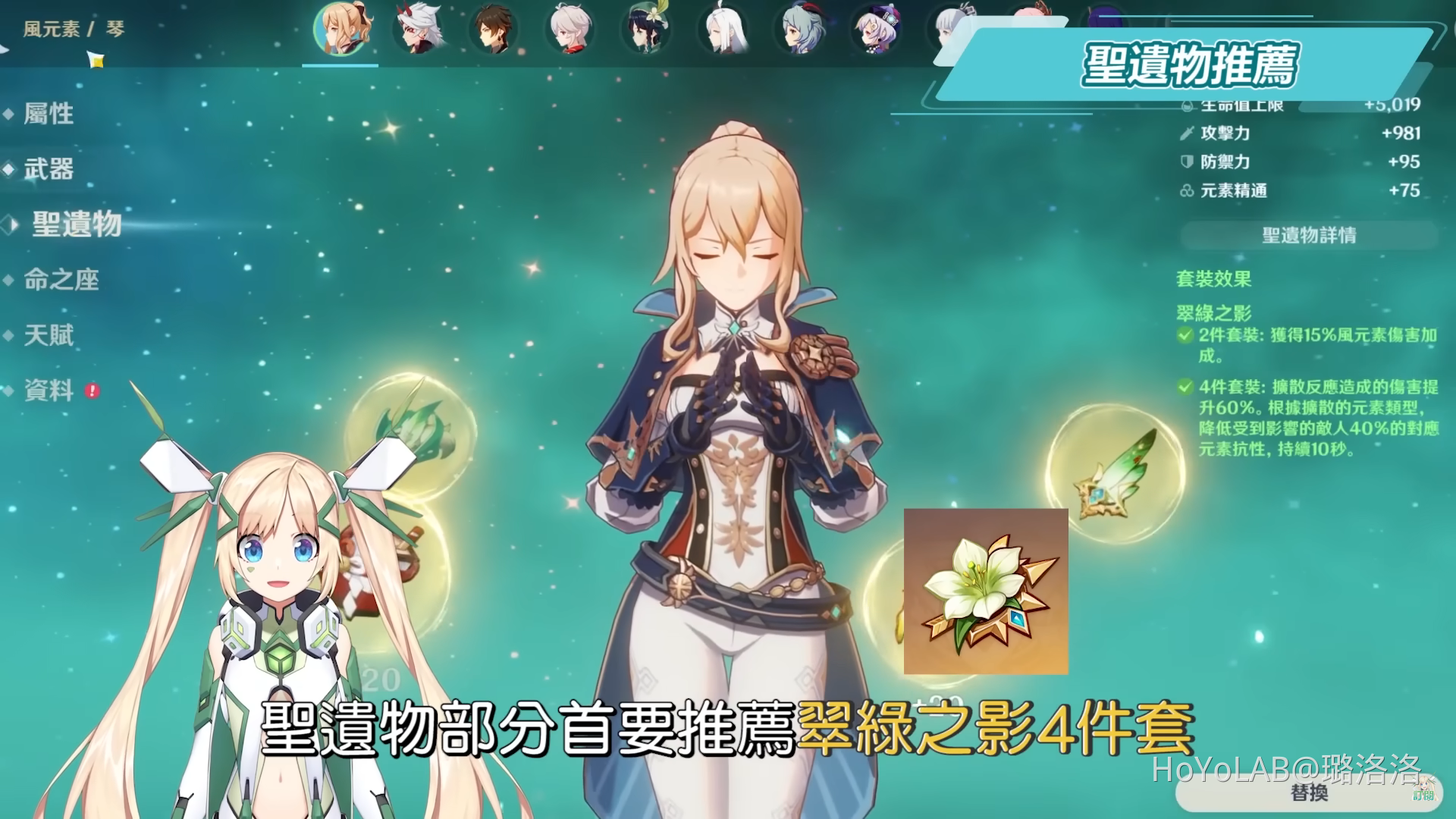 聖遺物部分首要推薦翠綠之影4件套,主要是要風套4件的擴散減抗輔助效果,若是過渡期也可以採用風套2件加上可以提供攻擊力%數的2件套(角鬥士/行者之心/勇者之心/追憶/辰砂/來歆),以琴有輸出作用的情況下,就比較不推薦純奶*穿的少女4件套。