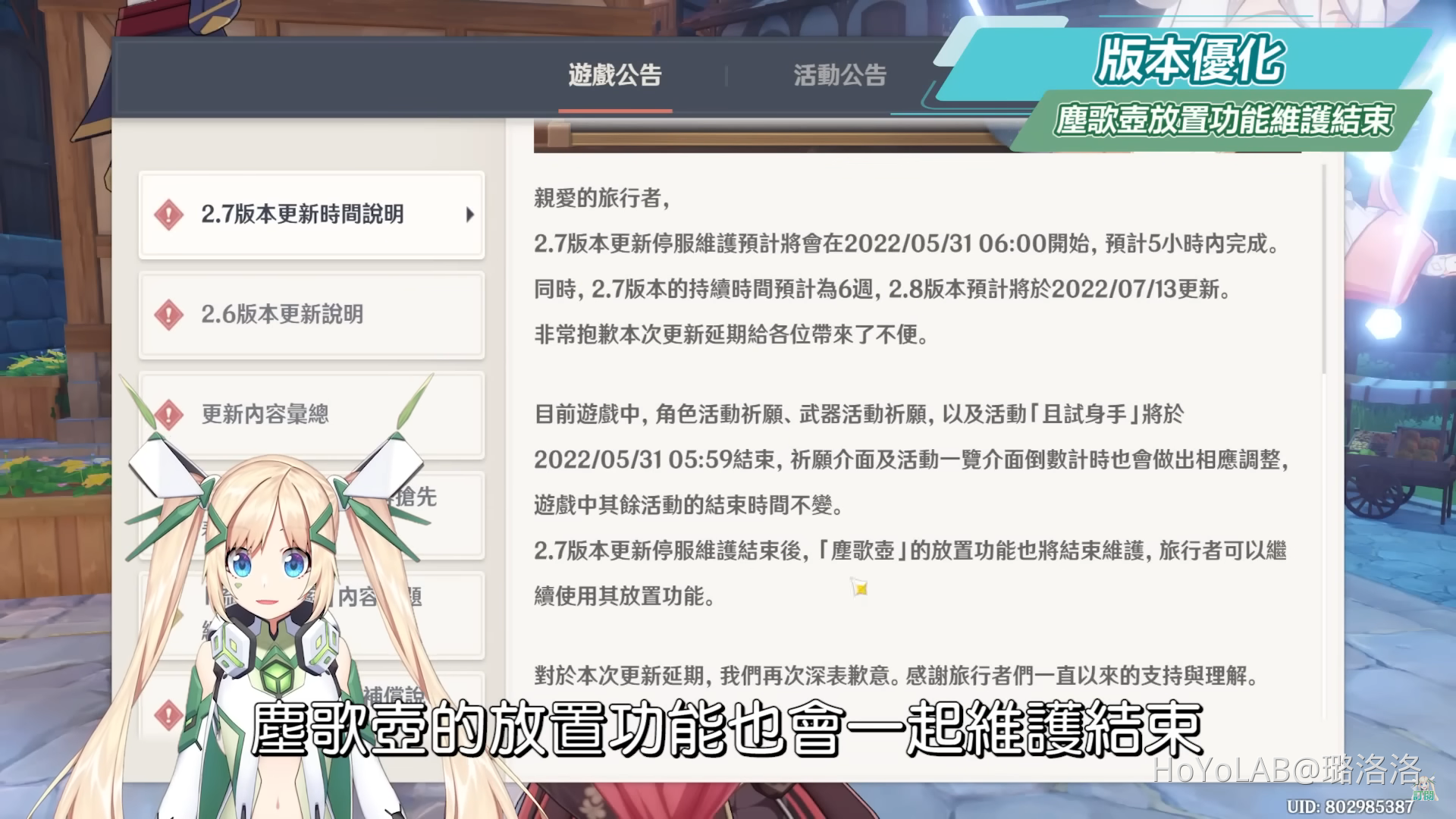 最後一個是前瞻直播沒有提到,但是洛洛放進來一起補充的一個重點,就是很多玩家關心的塵歌壺維護究竟會到什麼時候,在遊戲內公告中官方有表示在2.7版本更新維護結束後,塵歌壺的放置功能也會一起維護結束,屆時就可以使用放置功能啦,而目前2.6版本的「有香自西來」也會是一個跨版本的活動,到時候也會有機會拿料理去給夜蘭試吃,算是一個小確幸囉~