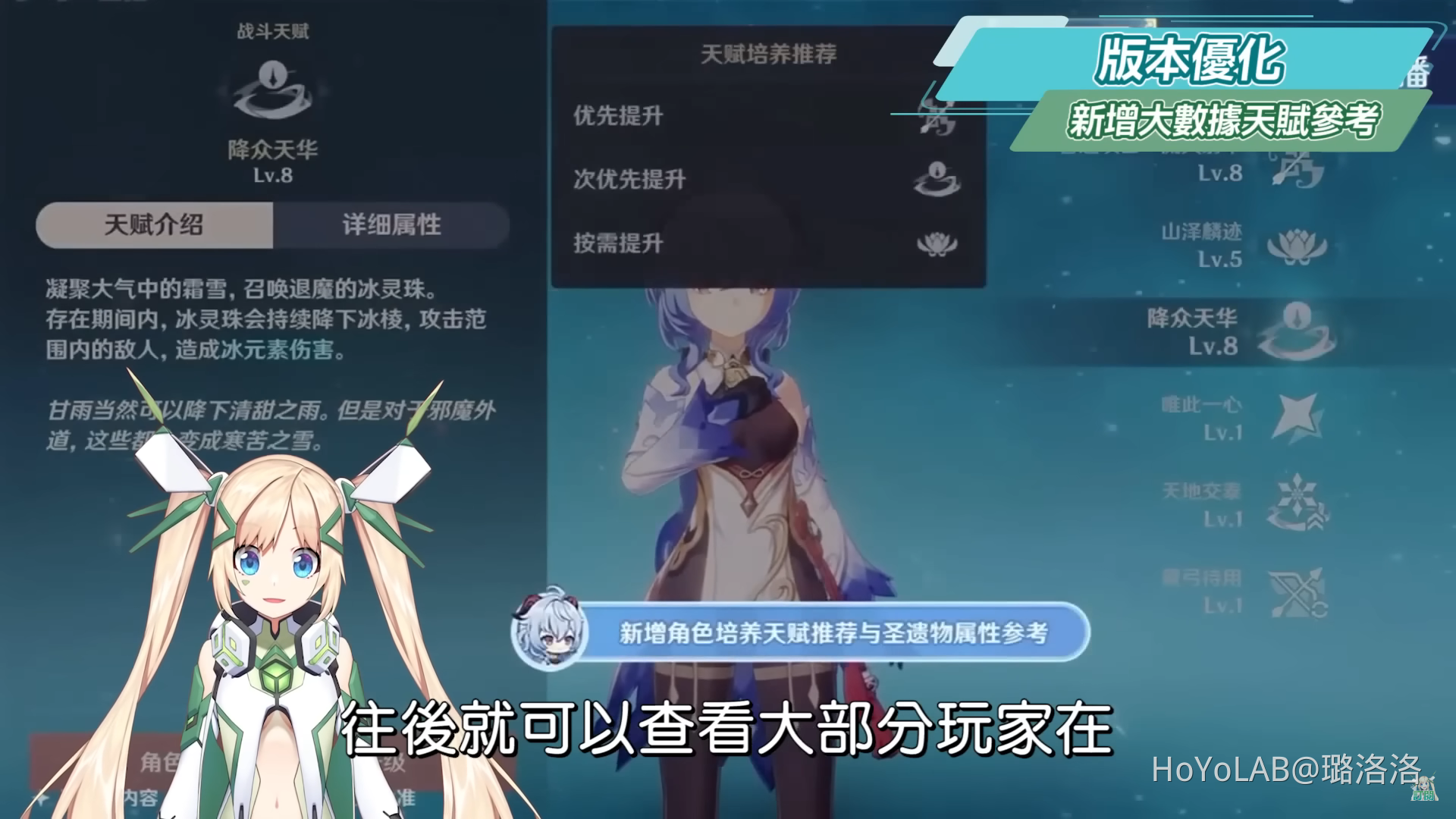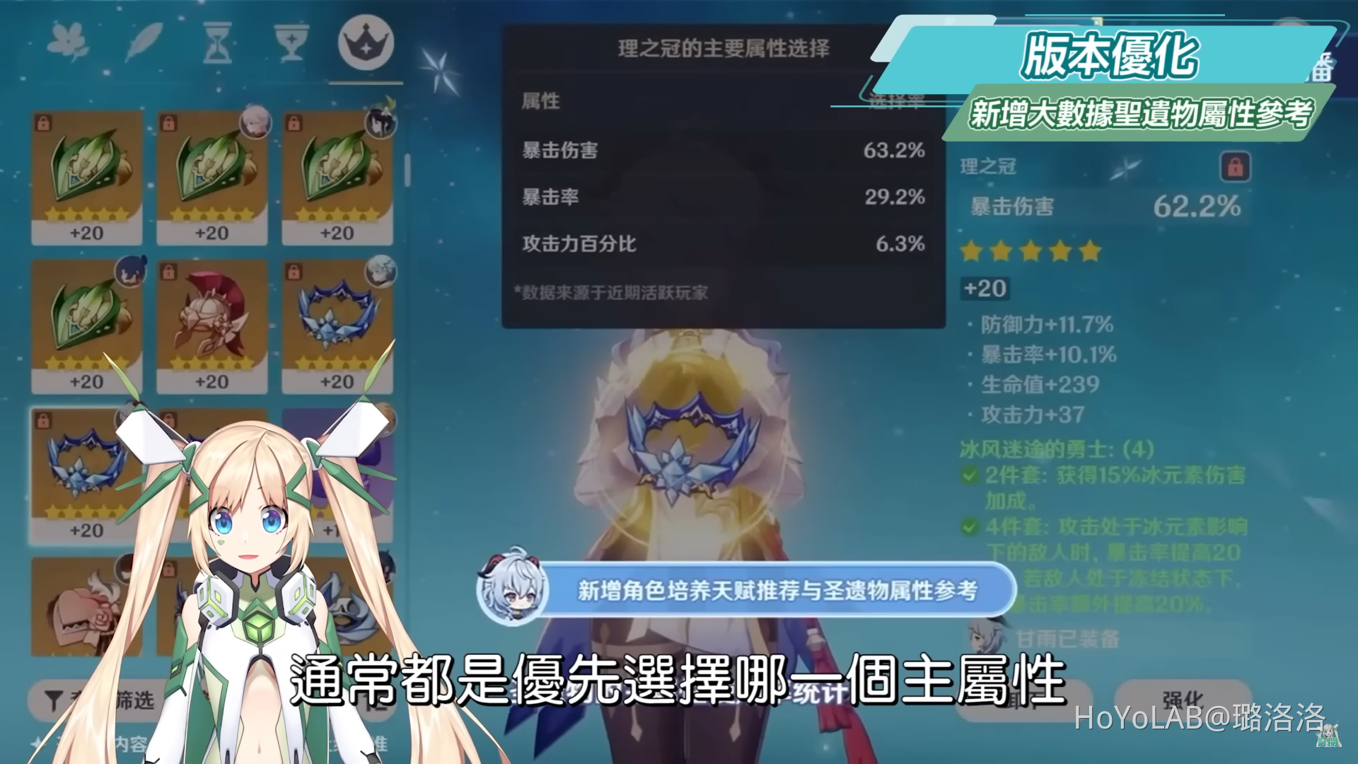 第三個是在每個角色的聖遺物介面也新增了聖遺物「屬性參考」的按鈕,同樣會收集大部分玩家的大數據,往後就可以查看大部分玩家在穿戴該聖遺物部位時,通常都是優先選擇哪一個主屬性,而畢竟因為這是大數據,所以新角色剛出來時如果還是不知道要怎麼穿聖遺物的話,還是可以先參考洛洛的影片實測囉。