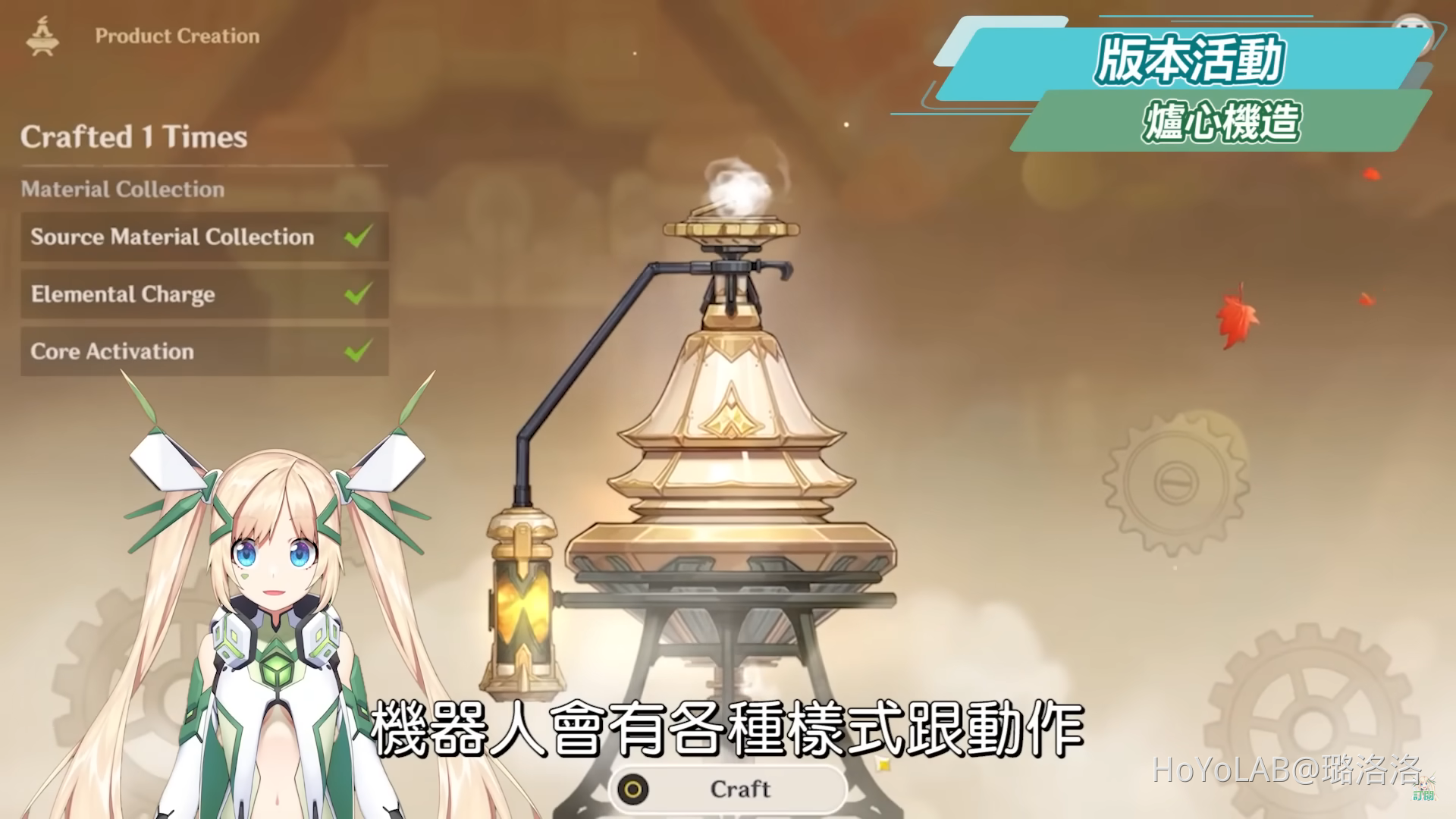 爐心機造可以從一個來自楓丹的玩具製造商伯蘭特那邊獲得一個素材收集器,在完成三道工序後就可以獲得一個動態機器人,可以擺放在自己的塵歌壺中,機器人會有各種樣式跟動作,關於樣式跟動作會基於你在三道工序中是如何製作的,會有一定的機會可以製造出能做出所有動作的特殊機器人,如果有缺少的機器人樣式,也可以和自己的好友進行互贈來拿到自己想要的機器人。