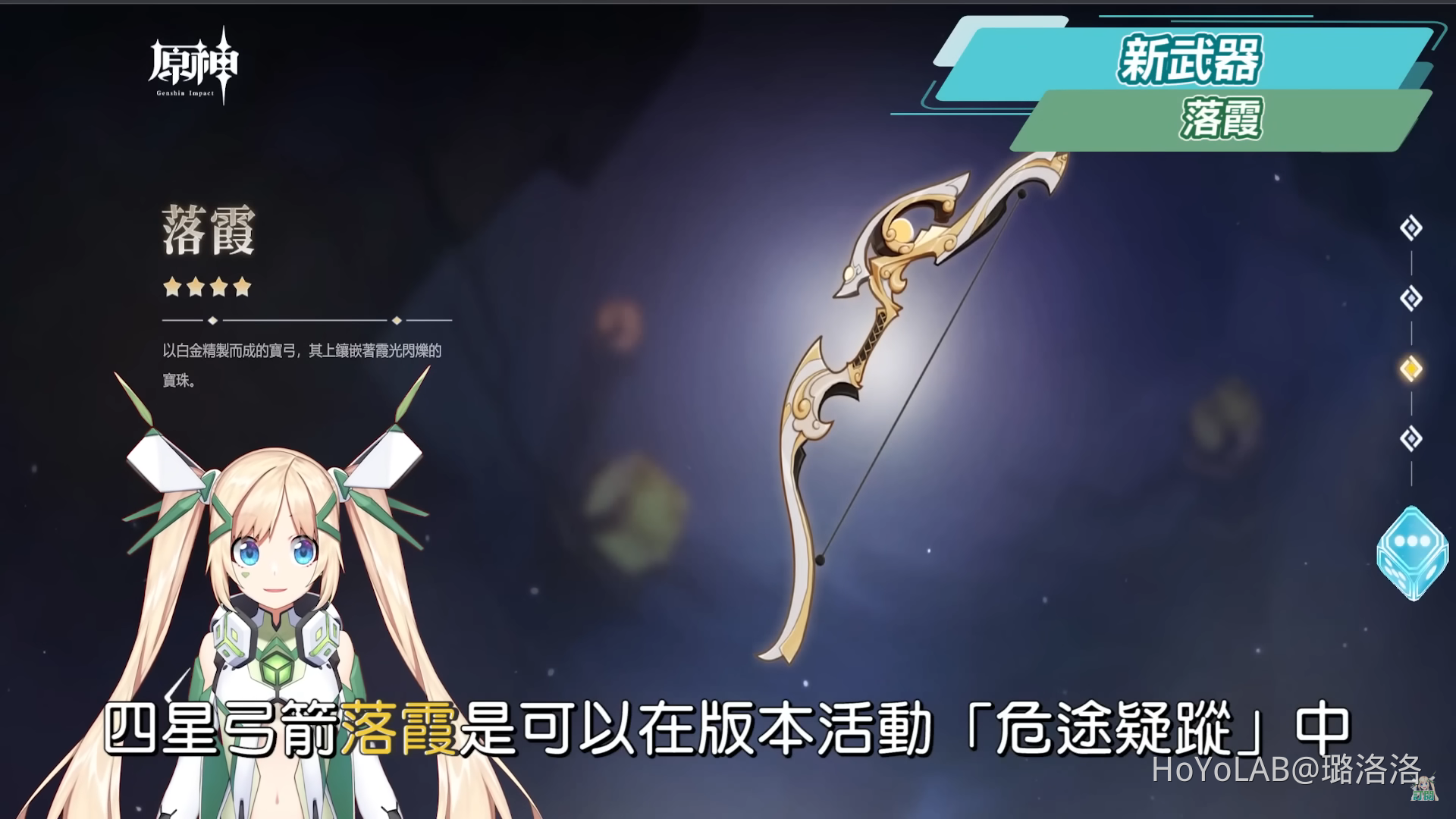 四星弓箭落霞是可以在版本活動「危途疑蹤」中免費取得的武器,以及相關的精煉材料,副屬性提供的是元素充能效率,被動效果可以使造成的傷害提升,只要攻擊一命中敵人後,就會依照弓箭上所擁有的夕暮、流霞、昭暉三種不同的狀態,得到不同的傷害提升,每7秒最多轉換一次,即便裝備弓箭的角色處於後台也同樣具備轉換效果。這把應該也可以是作為副C/輔助定位的夜蘭可以使用的次選武器。