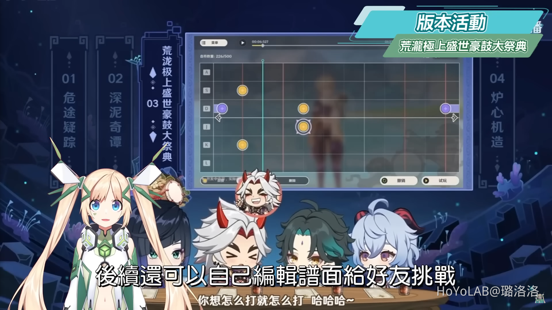 荒瀧極上盛世豪鼓大祭典應該是目前名稱最長的活動了,主要就是類似LoveLive!音Game的玩法內容,和先前的音遊活動一樣會有不同的難易度,可以一開始就直接挑戰最難的難度,一次拿完前面的獎勵,另外這次比較不同的是若是完成**級難度的話,後續還可以自己編輯譜面給好友挑戰,遊戲系統裡面也可以透過設定去調整音遊的延遲校準。
