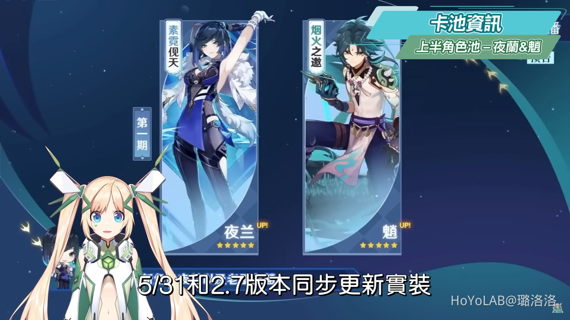 首先登場的上半卡池將會在5/31和2.7版本同步更新實裝,這次2.7版本時間據官方表示將會為期六周,2.8版本預計會在7/13更新,在2.7上半卡池中除了有新角色夜蘭的登場和魈的復刻之外,也會有對應夜蘭的新專武若水的登場,而也因為魈的復刻,武器池的另外一把武器大概率就會是和璞鳶了,夜蘭中配的聲優為徐慧,日配的聲優為遠藤綾,由於夜蘭適用於什麼樣的隊伍還需要實測,因此洛洛會在夜蘭正式推出後再做詳細的角色全分析影片,而魈的角色全分析影片先前已經製作過兩支了,可以先點擊右上方資訊卡或是下方影片描述欄的連結查看,若是對於魈還有什麼問題也可以在影片下方留言,洛洛會看情況看是否再製作魈的復刻Q&A。