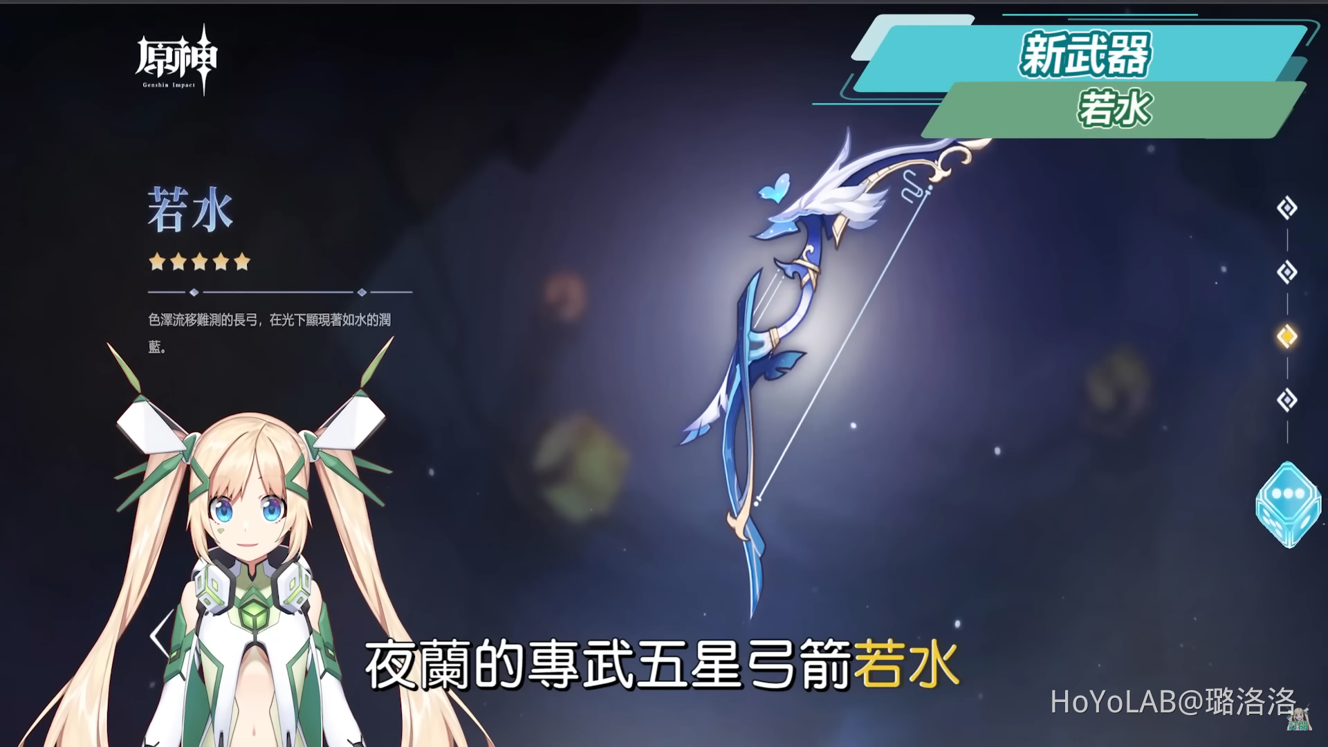 這次2.7版本隨著新五星角色夜蘭的登場,也按照慣例加入了看似夜蘭的專武五星弓箭若水,副屬性提供的是暴擊傷害,90等滿級可以提供88.2%的暴傷,被動效果也是提供夜蘭需要的生命值,同時在周圍存在敵人時,可以使裝備該武器的角色提升造成的傷害,並且不論處於前台或後台都能生效,從整體敘述來看就是很適合夜蘭使用的武器沒錯,此外由於副屬性提供暴傷、被動也提供增傷,或許也可以提供給一些需要輸出的弓箭系角色使用,相關實測心得等後續更新洛洛再跟大家分享。