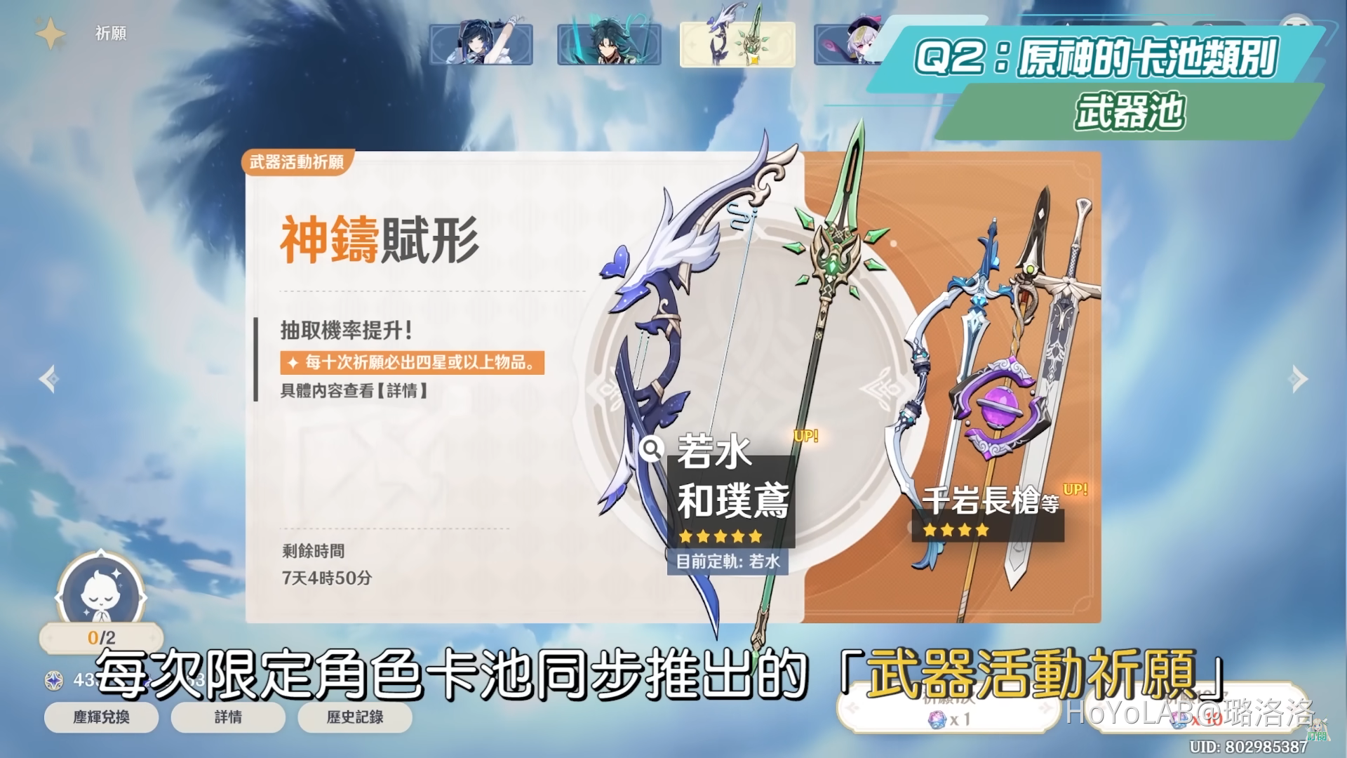 第四個卡池則是隨著每次限定角色卡池同步推出的「武器活動祈願」,武器池的機制稍微比較特別一點,同一個卡池中每次都會同時加倍兩把五星武器,通常都是效果和能力最符合當期限定角色的專屬武器,以及其他加倍的四星武器等等,其中四星紫光也會有機率出現四星角色,而這邊的四星武器有的會在詳情中標明即便卡池時間結束後,也不會進到常駐池中,像是千岩長槍、幽夜華爾滋這類武器等等。