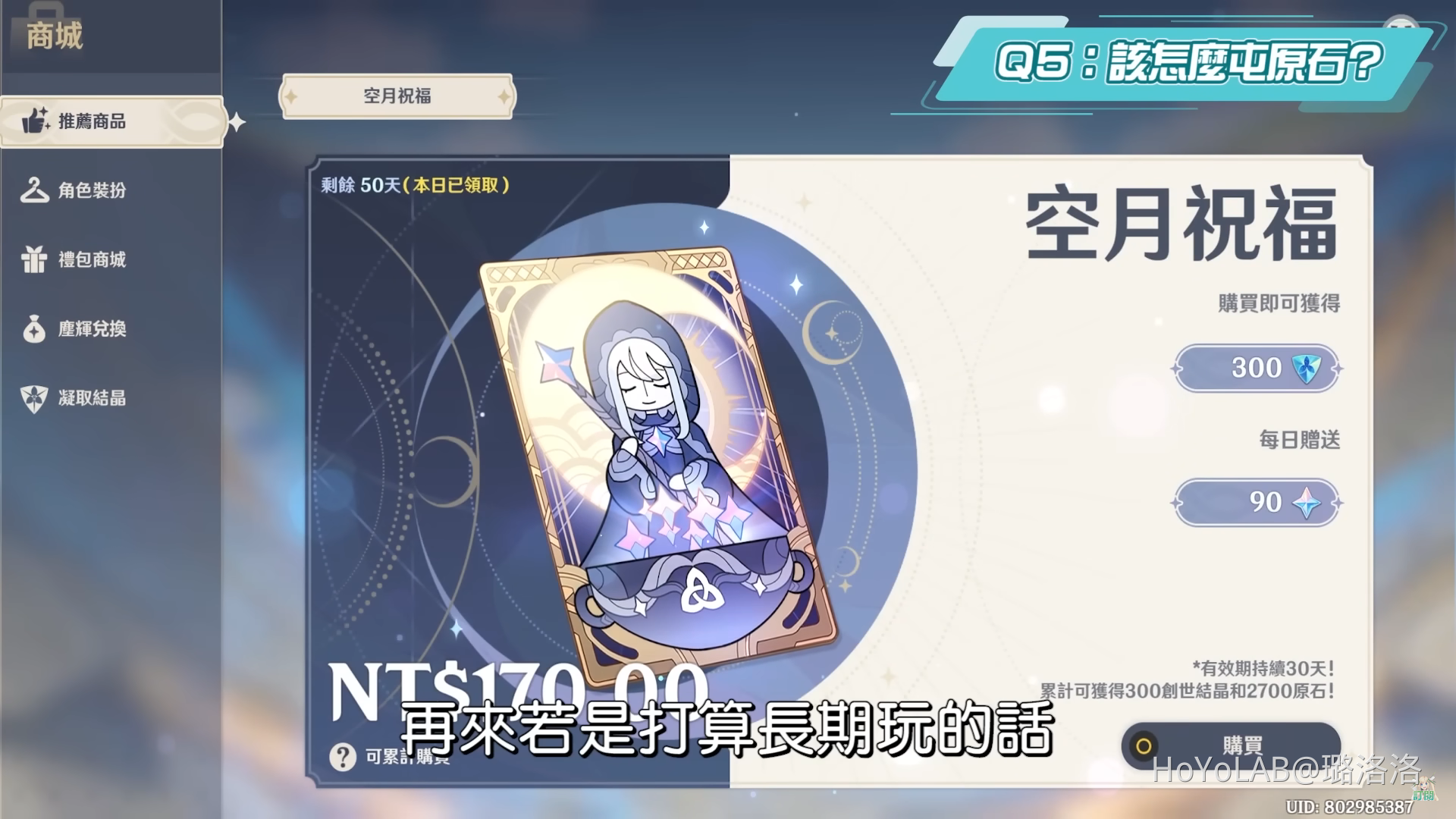再來若是打算長期玩的話,建議再買空月祝福,而若是每天也都會上線,希望培養角色的步調再快一點,也會建議再買珍珠紀行,裡面有送非常大量的摩拉和相關突破材料,當紀行等級滿等會再返還680原石,這樣每個月的基本花費大概只需要落在500元台幣左右,但是可以得到超過等同價值的內容*,*常推薦長期每天玩的玩家必買,即便玩到後期每天都有認真玩的話,非長草期一個月也可以屯到10000~15000左右的原石,大約2~3個月就可以存到大保底出五星角色的原石量,剩下就是讓自己的角色池更加完善,並且提升整體的隊伍練度去挑戰深境螺旋,每兩周若是都能9~12層滿星通關的話,也可以穩定獲得600原石,首次通關1~8層的話也可以總共獲得2400原石。