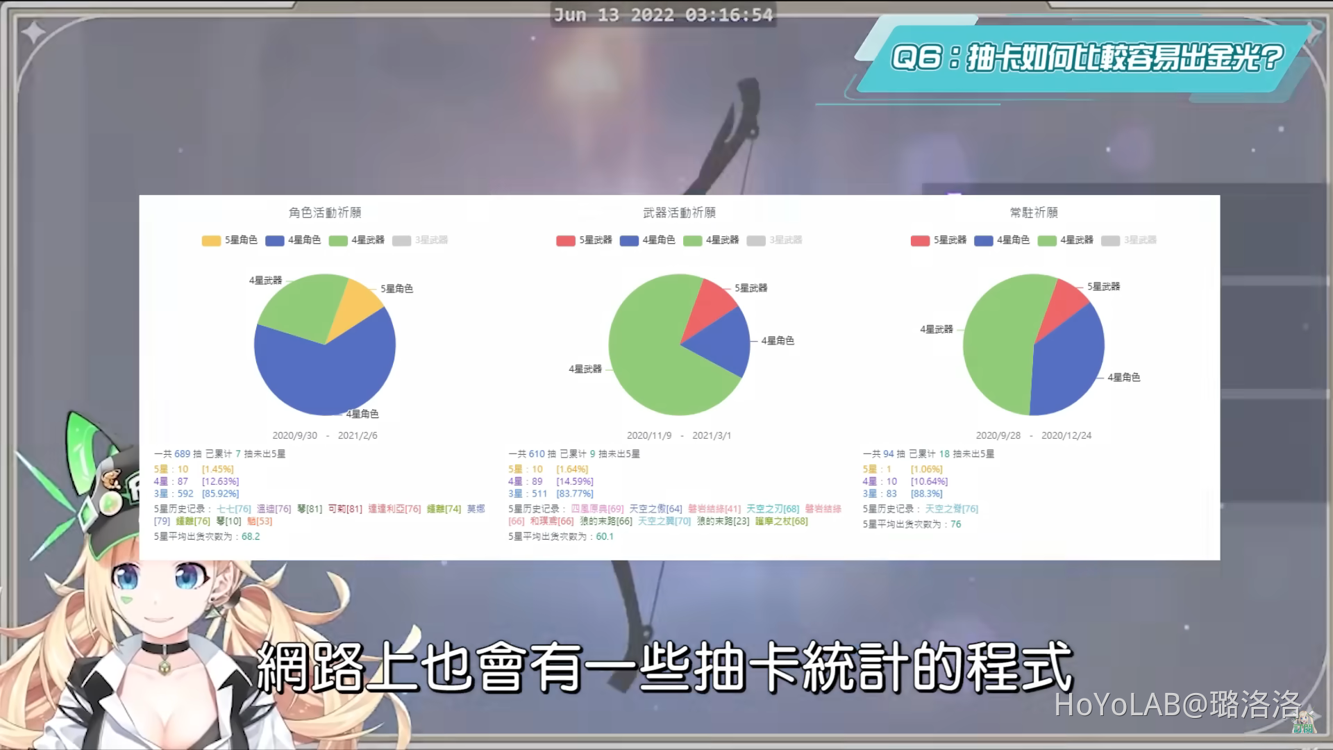 接下來就是依照一些抽卡經驗分享給各位新手們容易出金光的方式,這裡主要是按照大數據資料下提供的金光機率,雖然在角色池中,保底數最多會來到90抽,但是根據大數據顯示,通常在來到70抽以上時,出**光的機率會大幅增加,而武器池保底數最多80抽,但通常也是在來到60抽以上時,出**光的機率會大幅增加,所以通常你抽到50抽還沒有出金光的話,大概率再補個10~30抽就會出金光了,而如果你想要賭一把抽角色但是還不夠大保底的話,也建議是算一下在卡池結束前能不能屯到至少70~78抽左右的原石量,至少在這個區間算是比較容易出金光的抽卡數,而雙蛋黃有時候根據過往的抽卡經驗,有時候容易會出現在80抽以上還沒有出**光後的那十抽內,也因為怕雙蛋黃來得突如其來,所以通常在抽最後一個滿命命座或是最後一把滿精煉武器時,洛洛大概在角色60抽後、武器50抽後會開始改成單抽,若是剛好十抽出金光是小保底歪掉就還好,到下次限定卡池還可以有大保底抽,但有次就是在最後的滿命環節,不小心抽出雙蛋黃變成七命的情況,就尷尬了。而從大數據來看抽得越多,出五星的平均值也大概會落在65~75抽左右,網路上也會有一些抽卡統計的程式,有興趣的也可以搜尋關鍵字或是到洛洛的Discord群組裡面去找到程式來看自己的平均五星出貨數在多少。