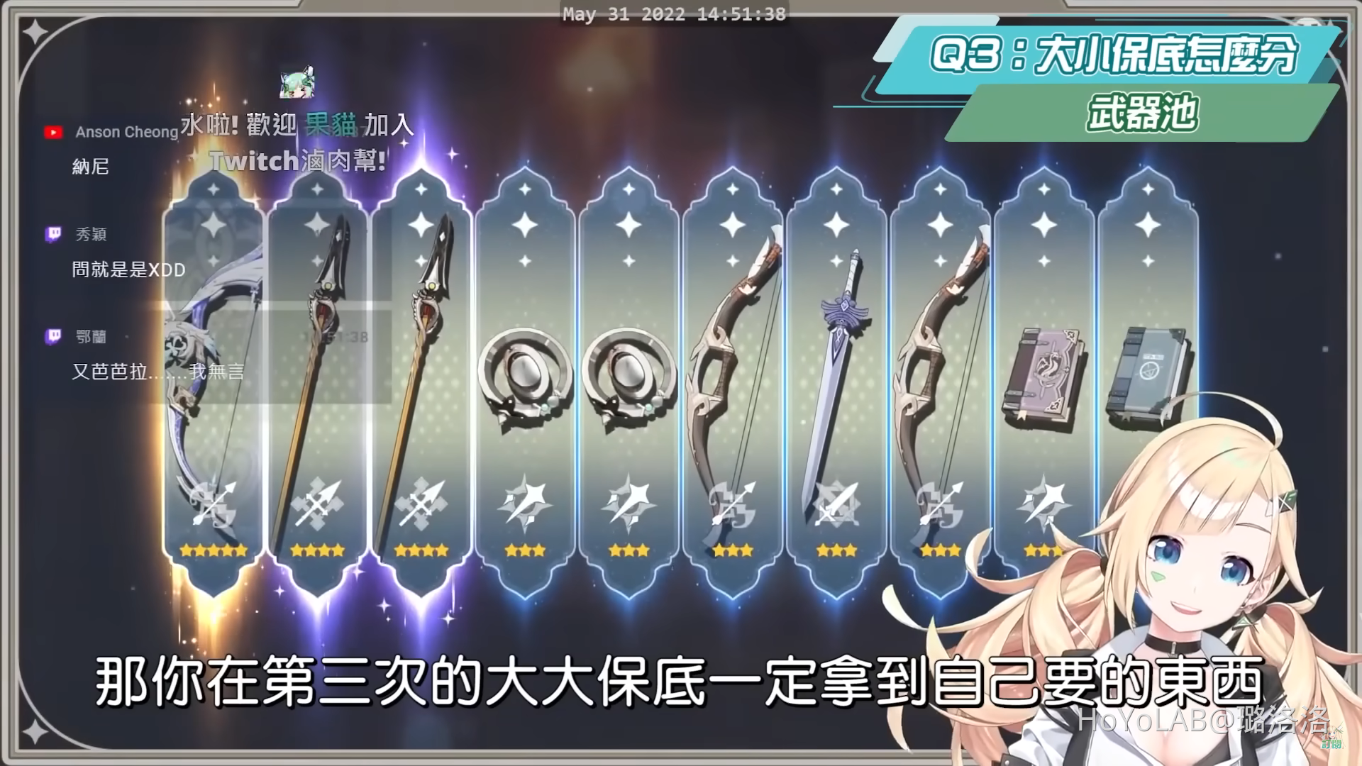而武器池方面就要評估自己的能力,平民玩家可以考慮使用珍珠紀行裡面便宜又好用的「紀行武器」,真的需要可以考慮抽給主力五星專武,像是霧切之迴光、護摩之杖這種,來提升刷聖遺物副本、打BOSS的效率,而只要深境螺旋都能滿星後,也就可以正式實現「抽卡**」,未來抽卡只須要看自己喜不喜歡就好。