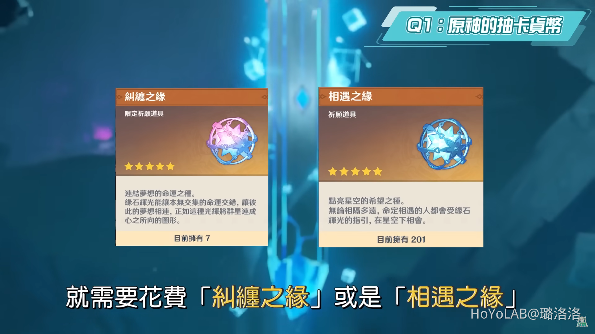 這邊就不代入一些統計學或是計算機率的概念來跟大家介紹了,畢竟洛洛自己的數學也不是很好,首先我們要知道在《原神》這款遊戲裡面,擁有多少角色是跟你的抽卡數有關,跟你的等級或是你的探索度沒有任何關聯,所以如果看到有人問說「為什麼我練到55級了,還是一隻5星都沒有」,就要跟他說:「因為你抽得不夠多」,而遊戲中要抽角色的話就需要花費「糾纏之緣」或是「相遇之緣」。