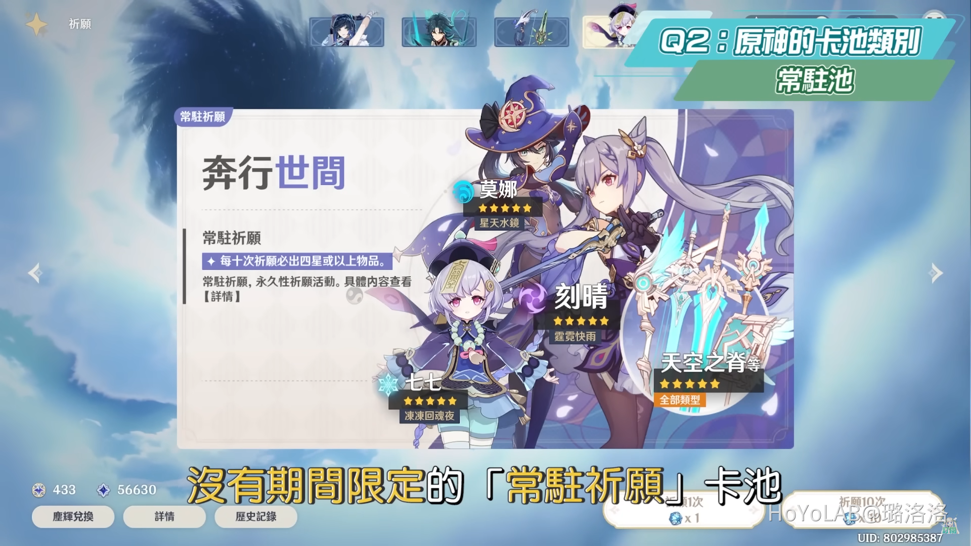 可以點擊「詳情」來查看卡池的抽卡機制,雖然這邊寫得很清楚,但還是會有很多新手一開始可能會看不懂,常常會經過抽卡的辛酸血淚後,用原石當學費上了一課,這邊洛洛用最簡單的方式來說,卡池的五星角色保底數為最多90抽,也就是說在1~90抽以內出現五星的金光都是正常的,所以新手不用再問說「10抽出五星正常嗎」,而金光裡面出現當期加倍角色的機率為一半,也就是當出**光時,會有另外一半的機率可能是常駐池會出現的那五虎將:迪盧克、琴、刻晴、七七、莫娜等等,但如果這次金光出現的不是限定角色,表示「小保底」歪了,那下一次的金光必定會出現限定角色,也就是大家說的「大保底」。而同時除了加倍五星角色外,每次官方也都會再加倍三隻四星角色的機率,這四星角色同樣也享有大小保底之分,每10抽必定會出現一次四星紫光,這紫光中有可能會是加倍的四星角色或是四星武器,當出現紫光也會有一半機率會是限定加倍的四星角色或武器。而角色池的抽卡數和大小保底都會延續到下一個卡池。