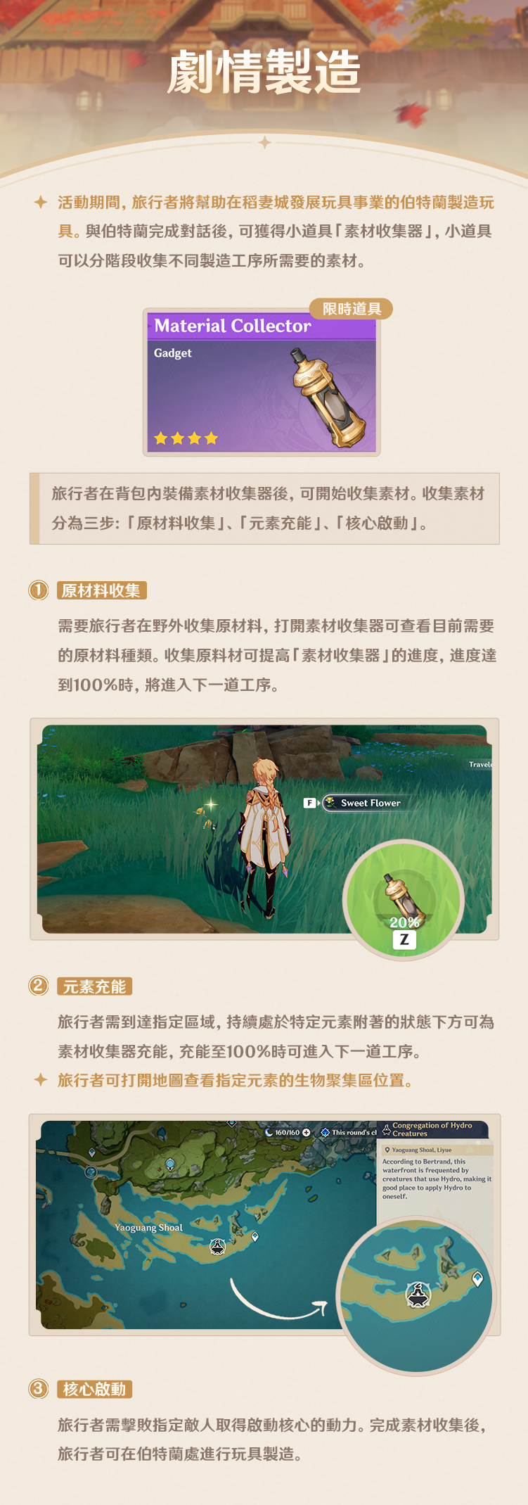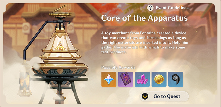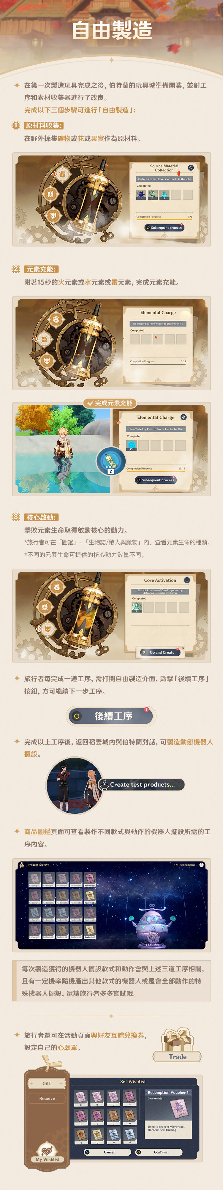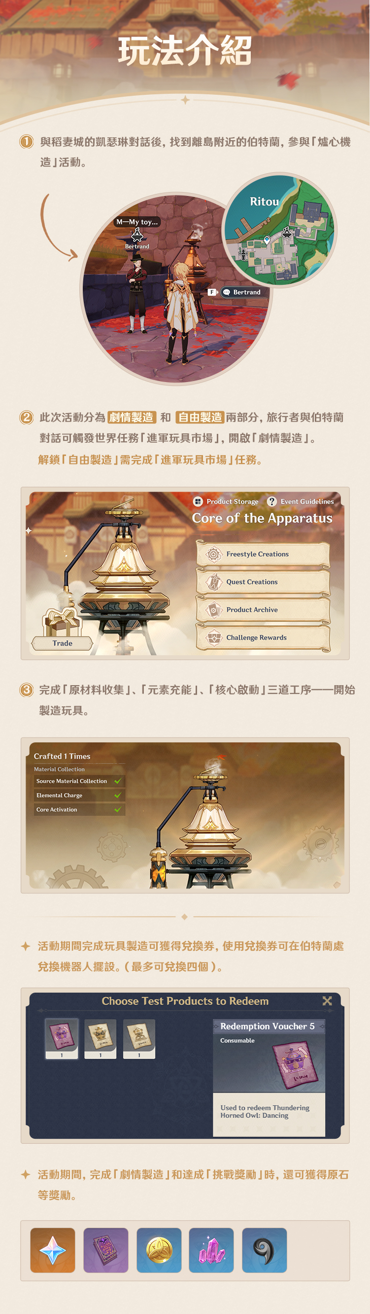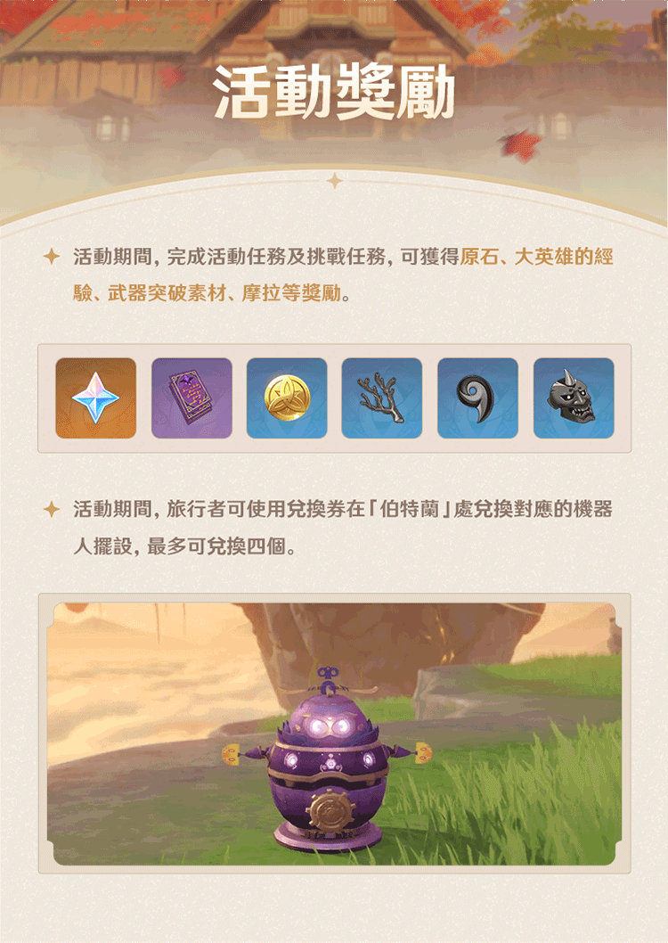 活動期間,幫助在稻妻的楓丹機械玩具商伯特蘭收集素材並製造試作商品,可以獲得兌換券。使用兌換券可以兌換動態機器人擺設。完成指定挑戰後即可獲得原石、大英雄的經驗、武器突破素材、摩拉等獎勵。
