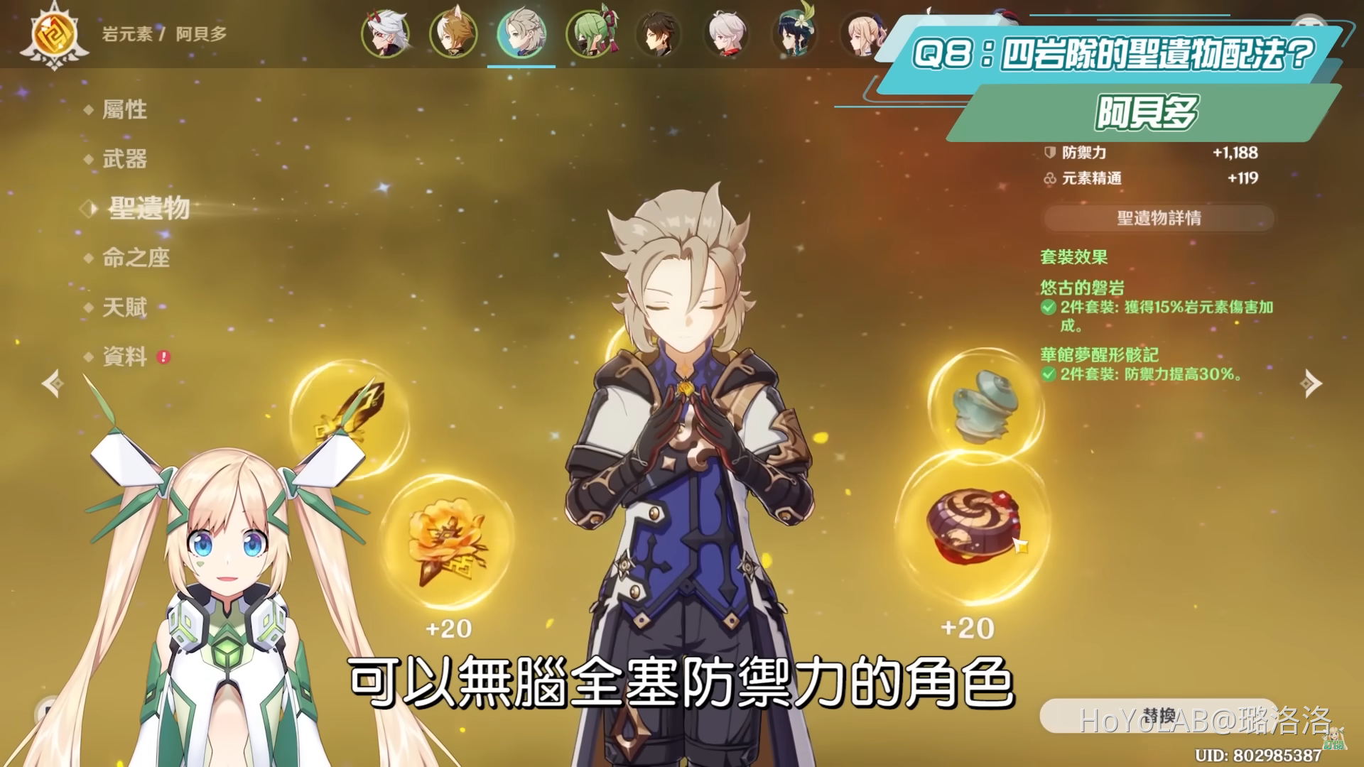 而其他元素的隊伍和需要的推薦輔助角,其實就算有推薦綁定的四星角色,也都是會希望命座越高越好,所以成本最高的地方其實是畢業的聖遺物才對吧?而岩隊的成員大部分都是需要穿華館4件套或是2件套,或是再搭配磐岩2件套等等,像是一斗、五郎、阿貝多、諾艾爾、雲堇這類受到防禦力數值影響的岩系角色,專練岩隊的話蹲一個聖遺物副本就好,而若是之前刷其他聖遺物副本,有歪到副屬性不錯的防禦力%數時之砂,也可以留給這些岩系角色使用。